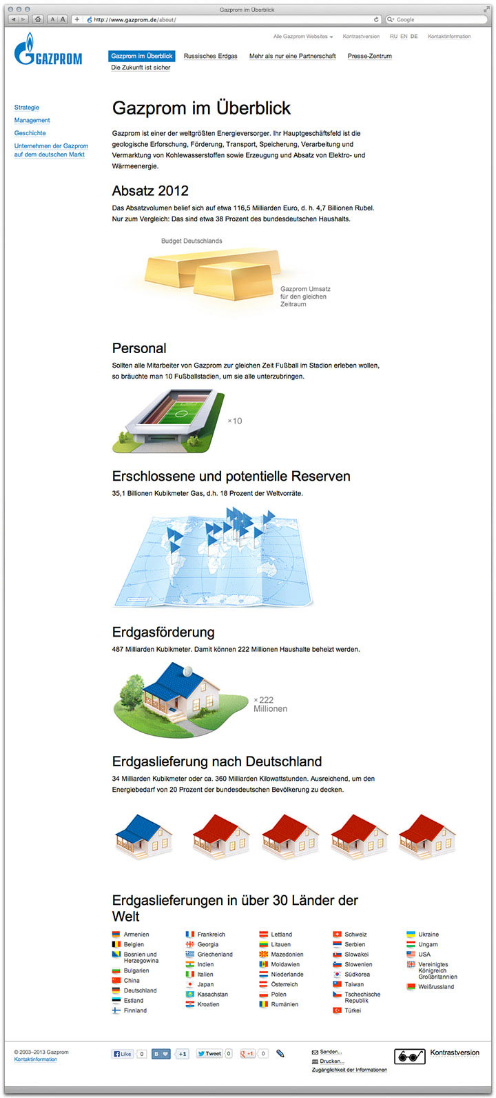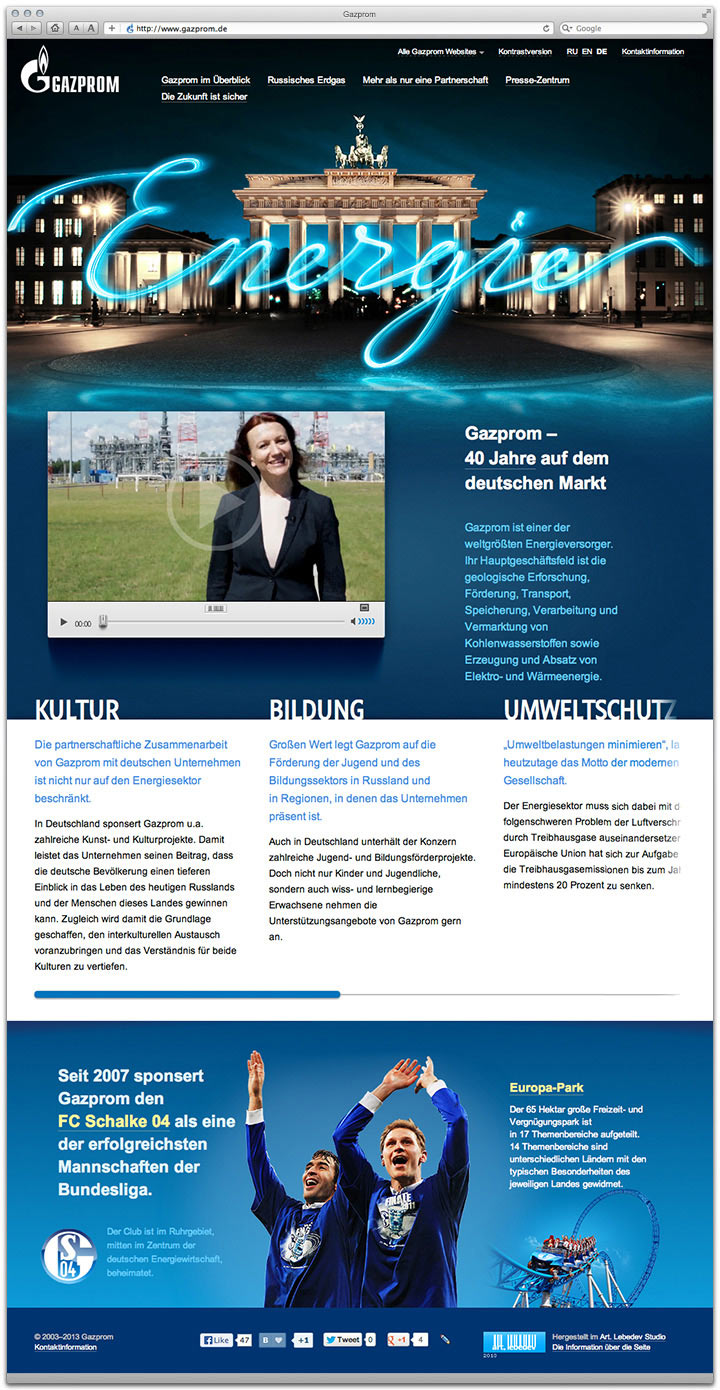 The German version of the website was created to celebrate 40 years of gas shipping to Germany. The website provides all information that might interest German clients and partners of Gazprom: issues of European energy security and prospects of a single energy market, history of coöperation between Russia and Germany, cultural and educational projects of Gazprom overseas, details about utilized technologies, environmental programs, and volume of gas shipments to Europe. A special section contains all important articles, interviews and press releases.