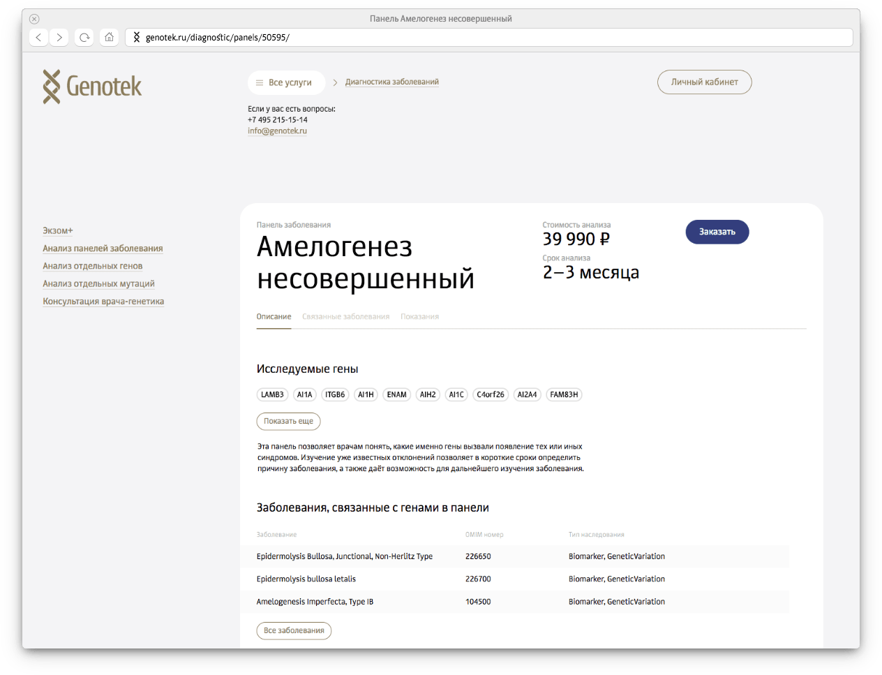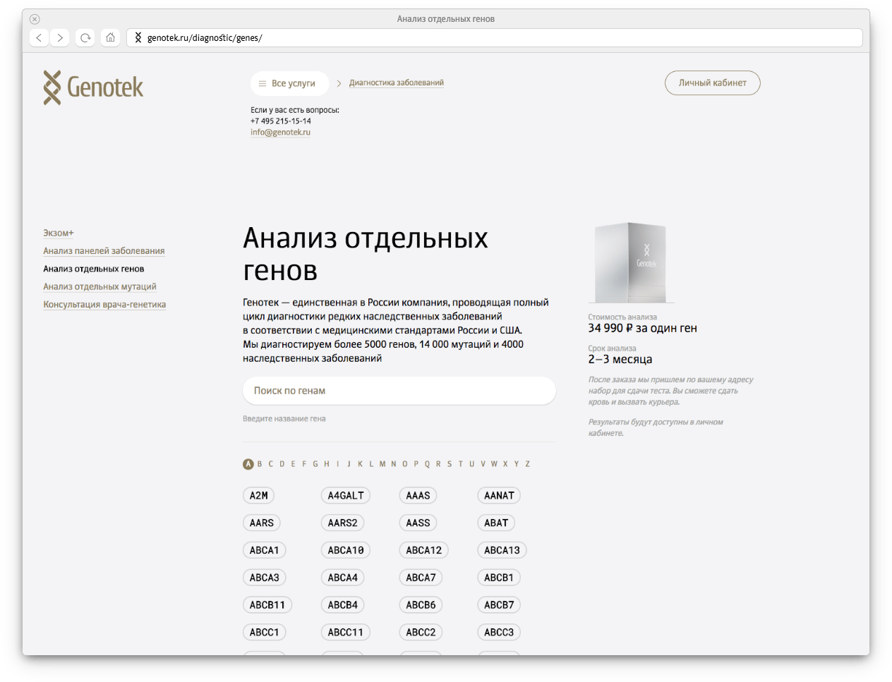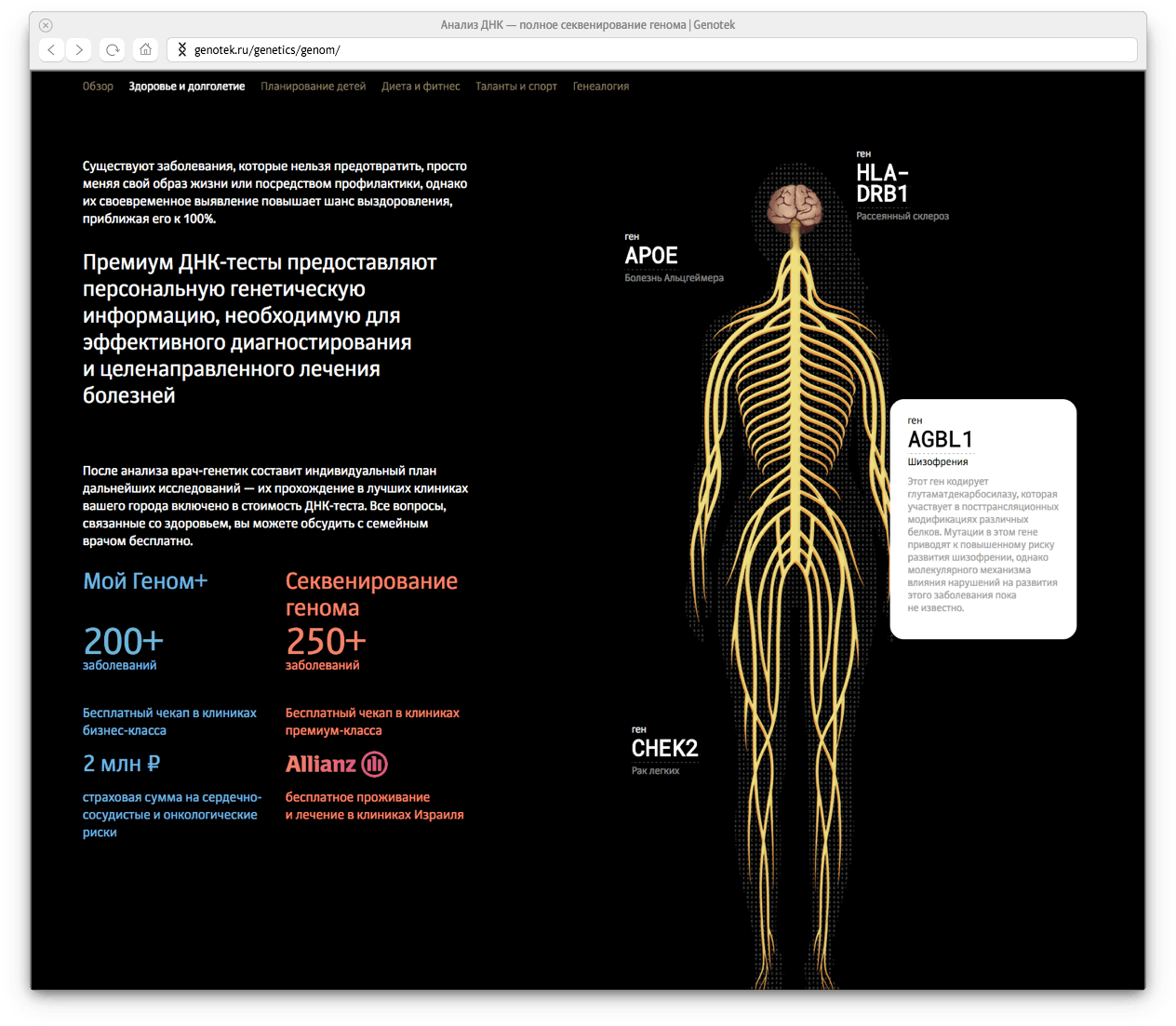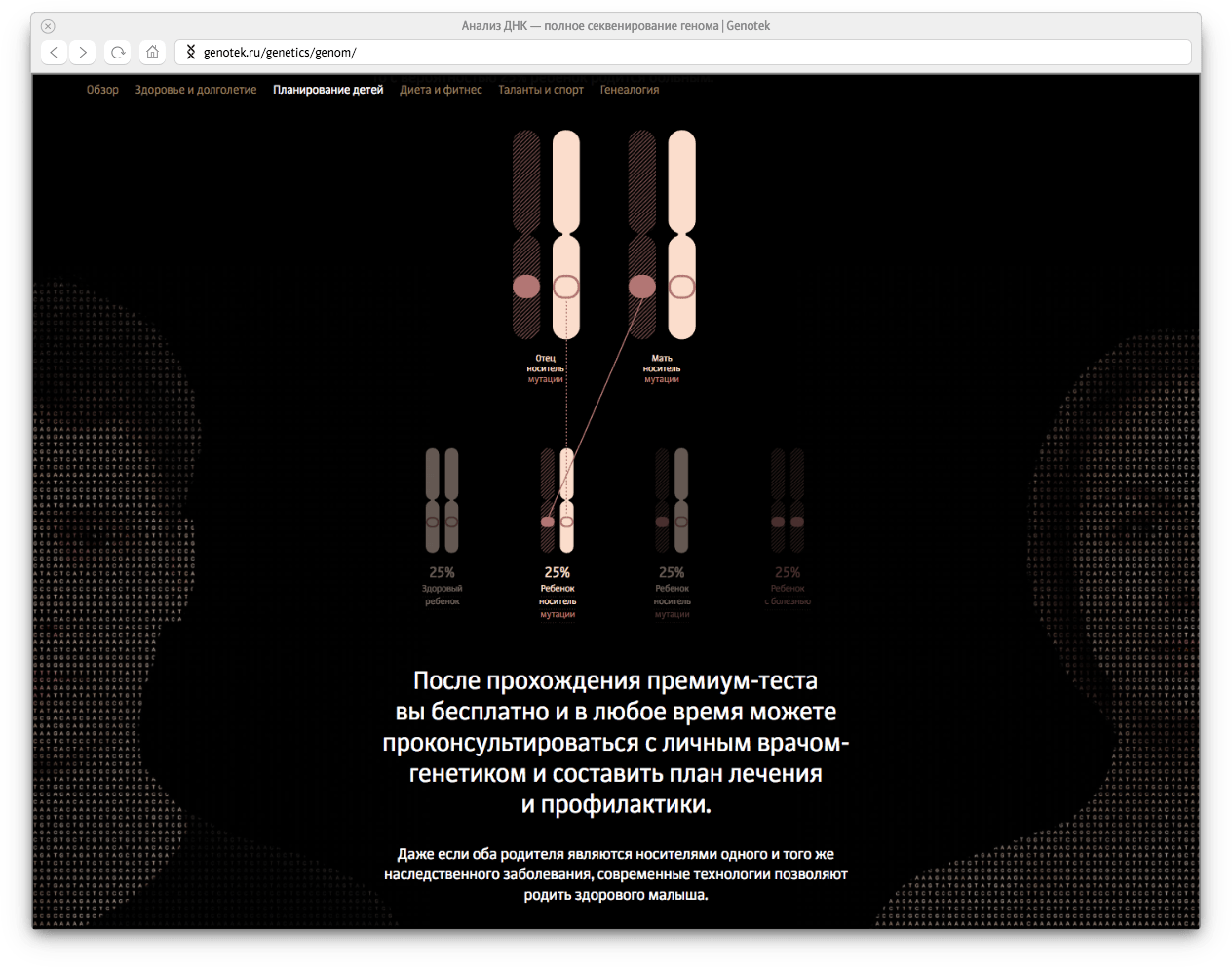 Founded in 2010 by three Moscow State University graduates, Genotek conducts DNA analysis and genetic tests for private customers and large institutions. A website presenting complex medical information in an accessible, structured and beautiful way was created at the studio.