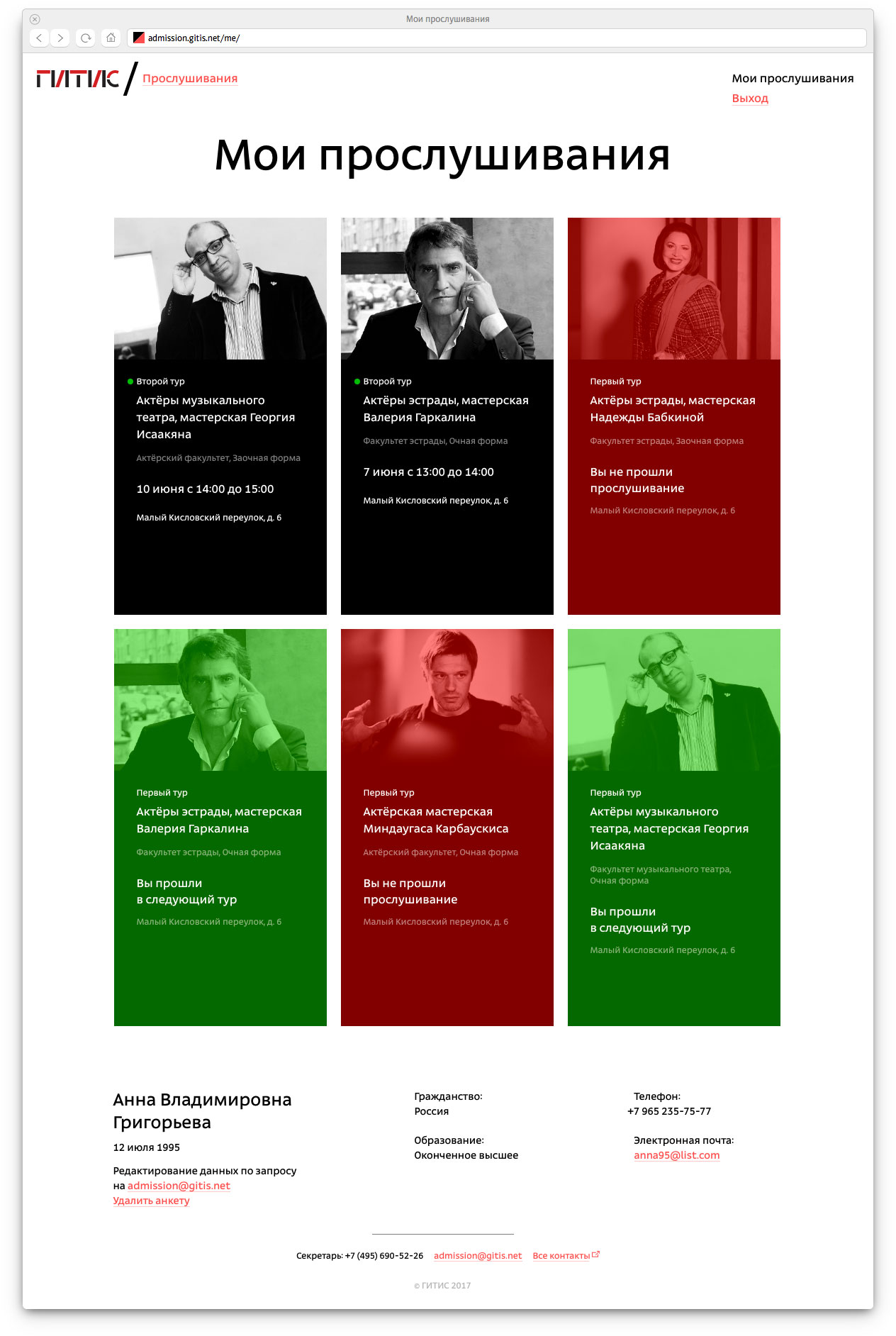 Every year, thousands of Russian Institute of Theatre Arts (GITIS) applicants form huge lines by the GITIS building to storm admissions offices trying to get an audition. The new website developed at the studio is designed to make life easier for everyone involved, including the institute’s administrative staff, professors and the applicants. Available courses can be sorted in three different ways making it easy to choose a major, get acquainted with future professors and explore institute’s departments.