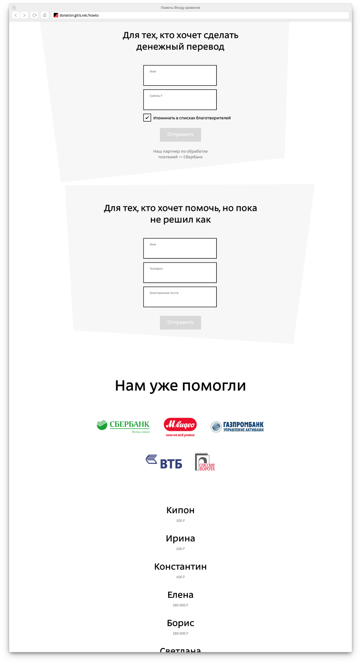 A website for the Foundation inspiring people and companies to help GITIS with money, products and services was created at the studio. The site contains information on how the money is spent and immortalizes the name of each donor.