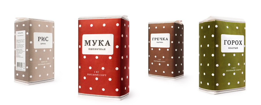 Paper bag designed to remind of polka dot kitchen tinware formerly common in Russia