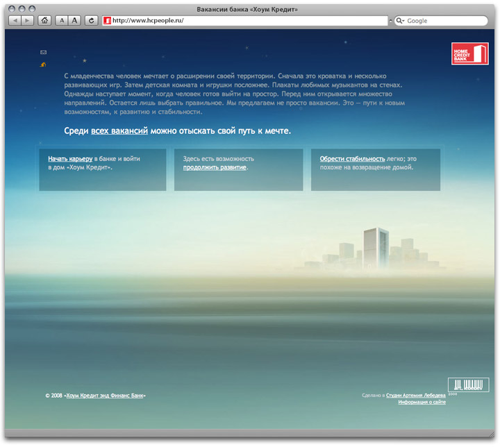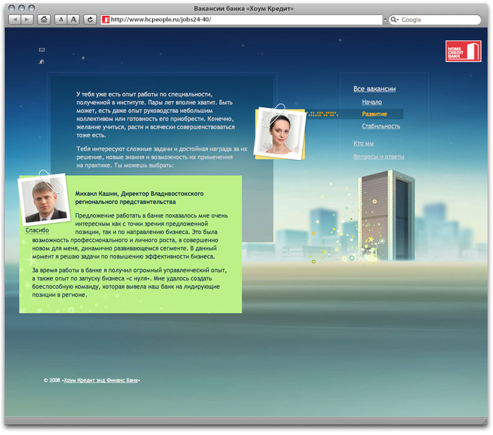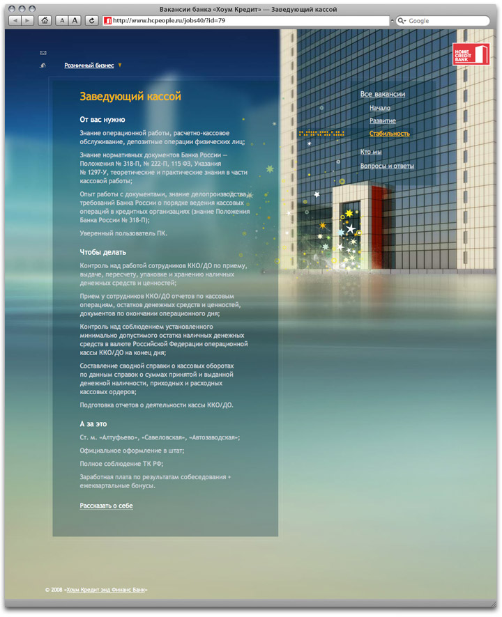 Home Credit Bank’s Russian division offers many career opportunities. Now they have a special website for publishing vacancy info. To find out details, jobseekers should approach a beautiful house. ![]() Front page
