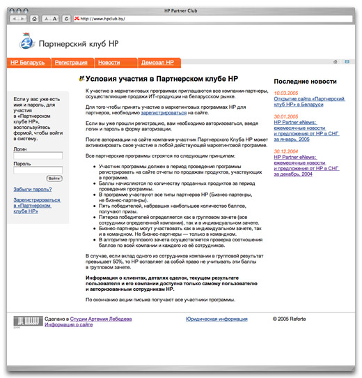HP Partners Club was created as a tool of Hewlett-Packard relationship with its partners in Belarus and features information on HP marketing programs. The website introduces the users to the full range of the companys marketing programs, allowing resellers to get complete information on special actions and choose the most attractive of them. To participate in HP Partners Club marketing programs, one must be an authorized partner of Hewlett-Packard and a registered club member. |