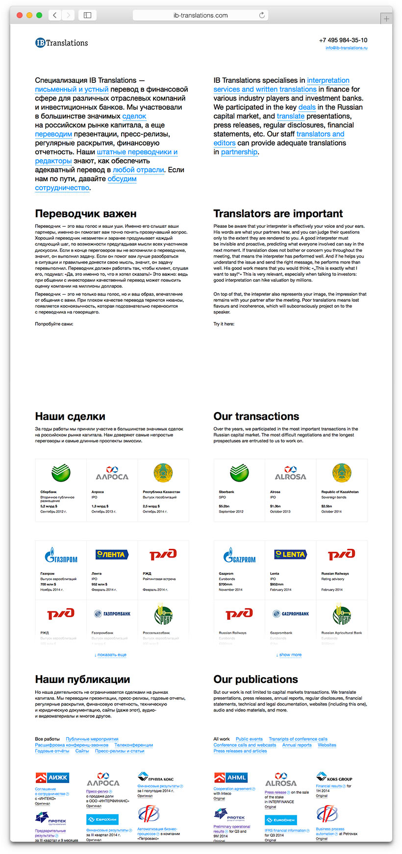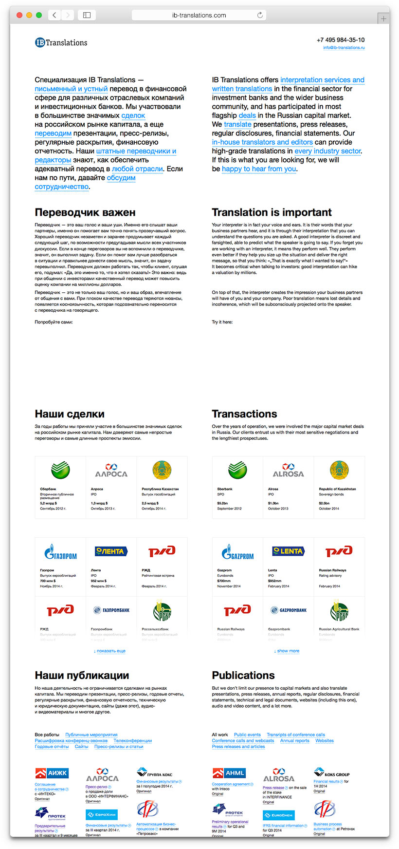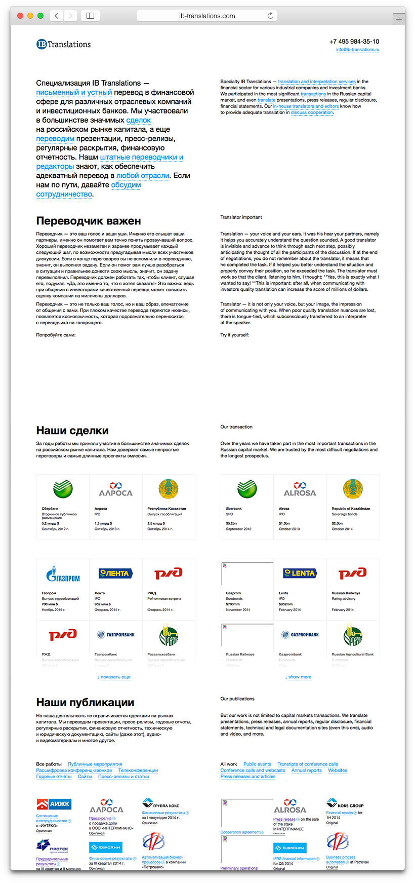 IB Translations provides translation and interpretation services and takes part in top-level events. Company experts attend mergers and acquisitions, support business negotiations, translate financial reports and legal documents, organize teleconferences and work with multimedia materials. The website created in the studio explains the importance of translation and demonstrates the advantages of a professional approach.