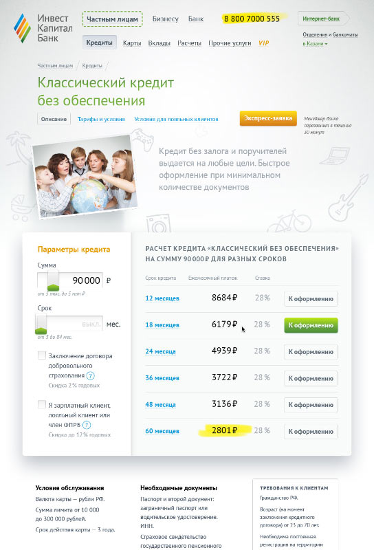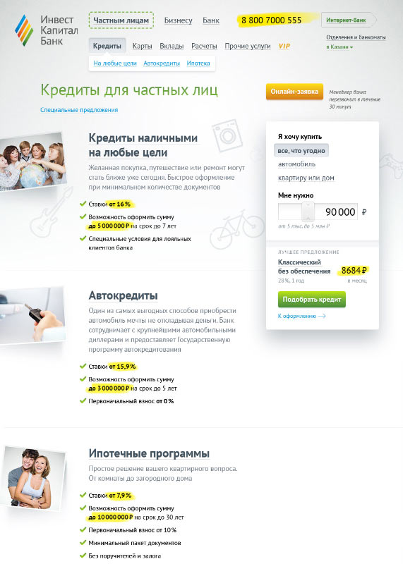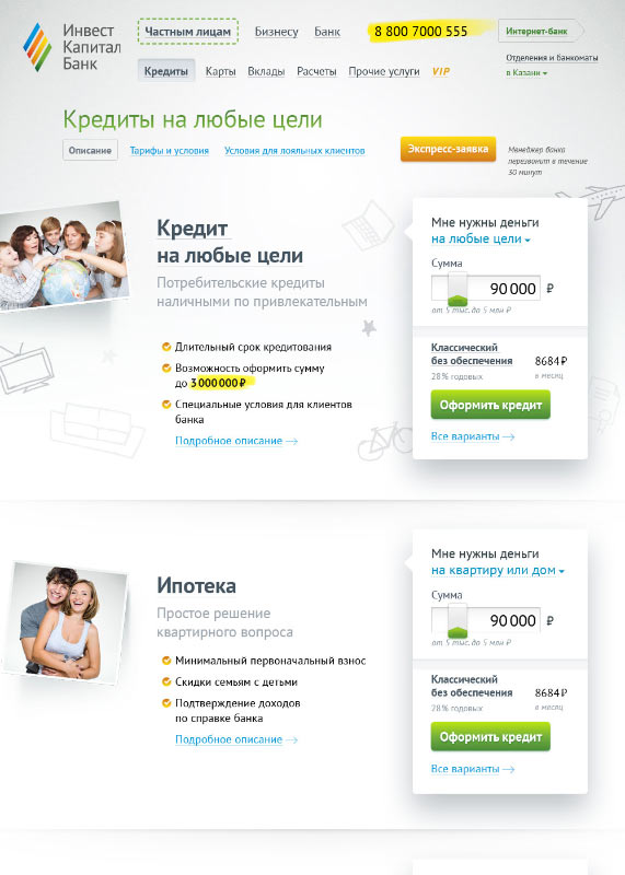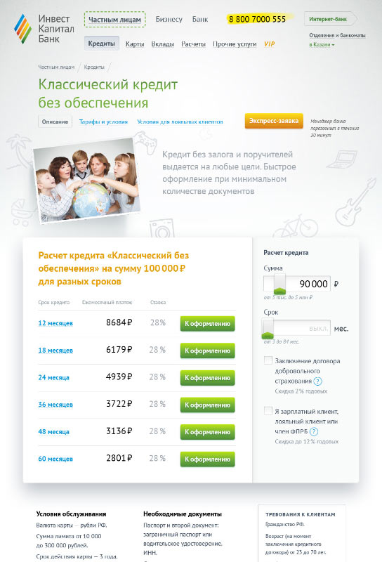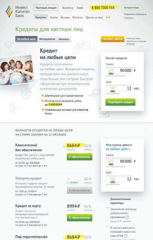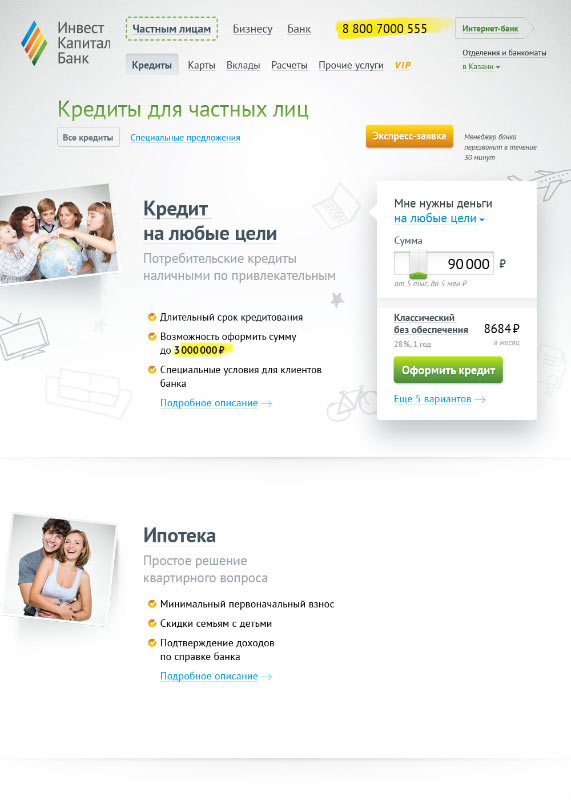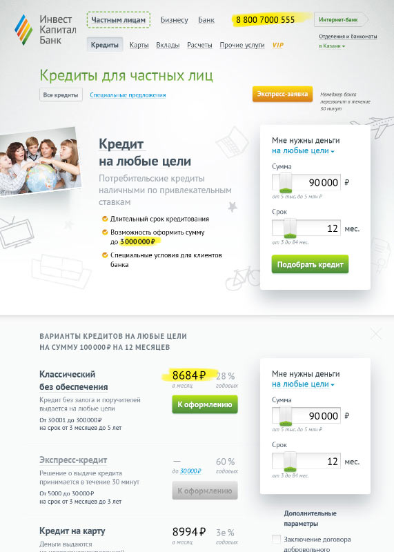 The bag looks nice. Screw the menu, we need only loans there. Nothing should steal attention from them. Wait, where are the calculation results? Displaying them. And adding some graphic elements—an integral part of the recently updated bank’s corporate identity.