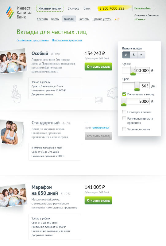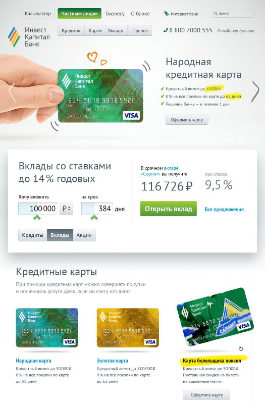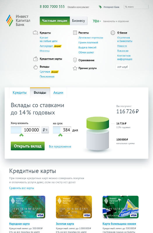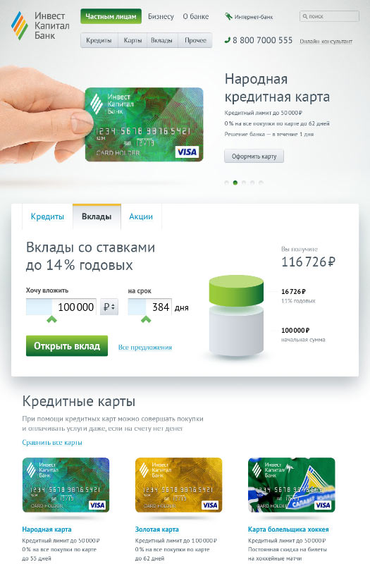 Looks good. Now we need another main page, the one with all the bank’s services. The page can be used on its own, so we use the traditional approach here: main menu, banner slider, calculator block and other common features of banking websites.