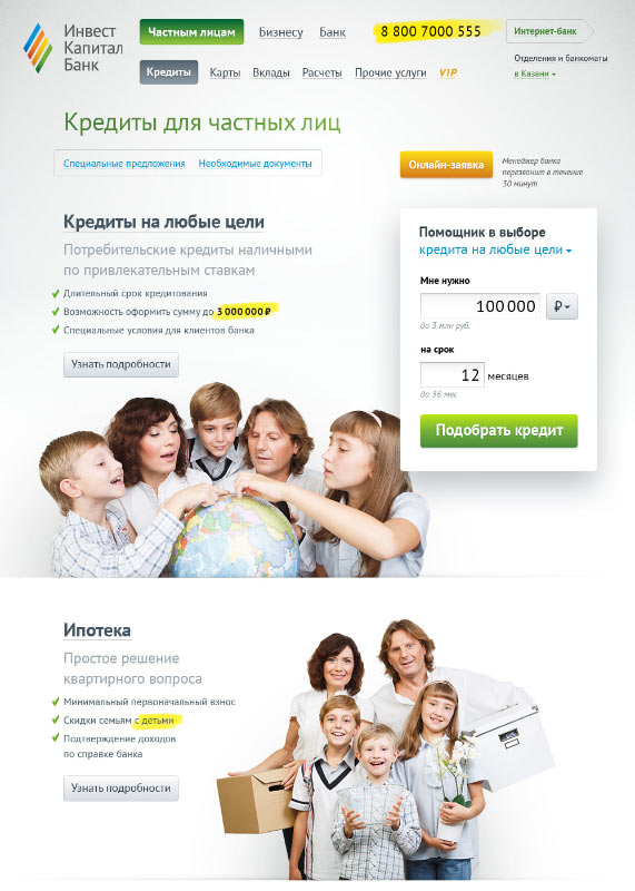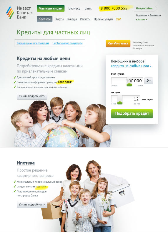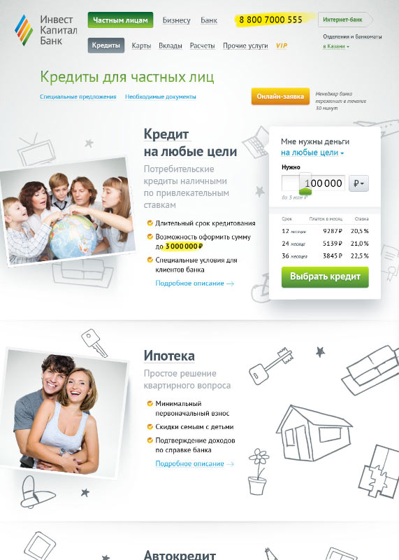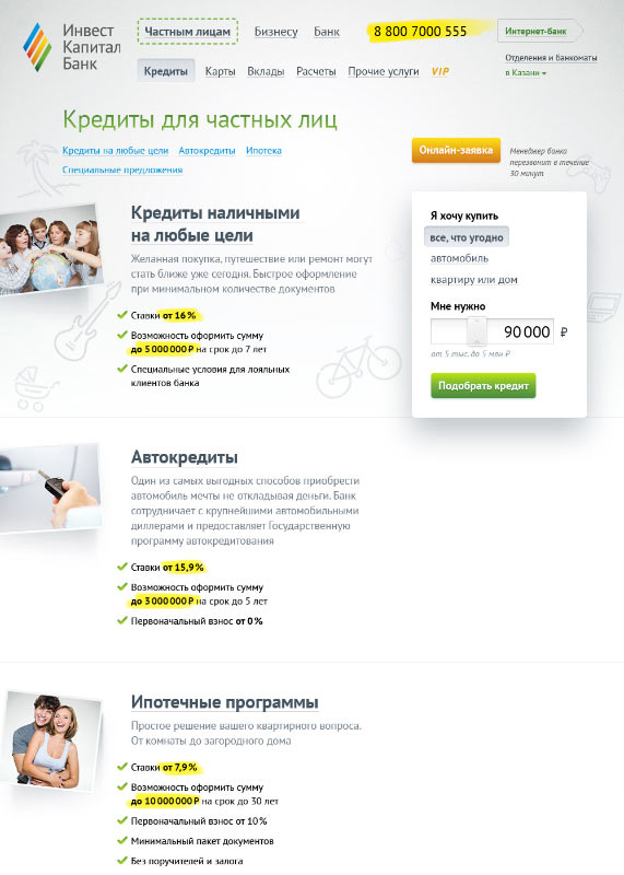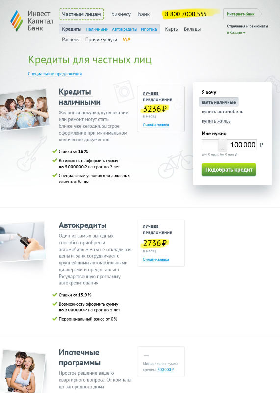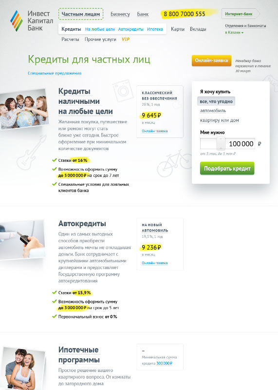 Diving into the exciting world of private lending. Payments, terms, rates, downpayments, repayment schedules, equal monthly installments, guarantees, collaterals, document lists, maternity subsidies, mortgage options, car loans. The bank offers two dozen programs of private lending which are divided into cash loans, car loans and mortgage programs. Calculations are different for each group. At the same time, it is assumed that all groups will be represented on the website as clearly as possible, preferably all at once and on the same page.