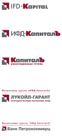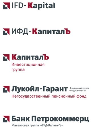 The updated logo is used by all companies of the group: Petrocommerce Bank, the Kapital Insurance Group, the Kapital Investment Group, several pension funds, the managing company and Ukrainian offices. Each of them got a ready-to-use logo with the sign and the typeface.