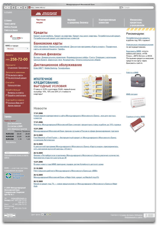 The first version of the International Moscow Bank website was launched in early 2003. The bank had at that time six offices and around ten ATMs in Moscow. The number of offices has doubled by now, while the ATM network spreads throughout Moscow and St. Petersburg districts. The banks branches operate in 17 Russian cities. ![]() The website main page is at the same time the main page of the Private Customers section