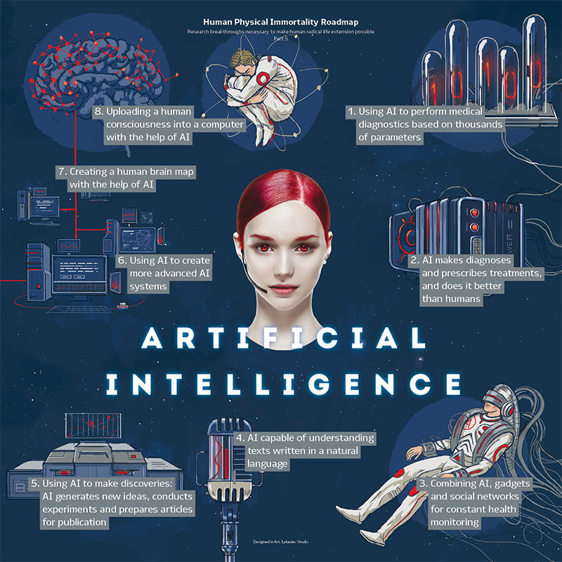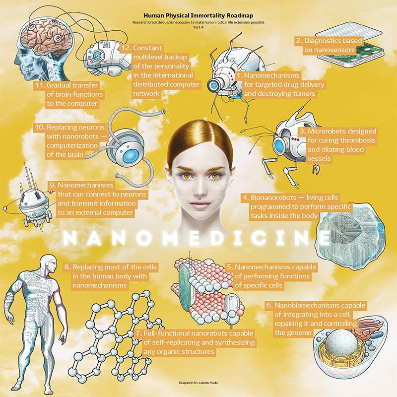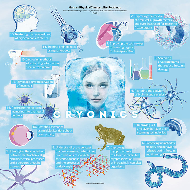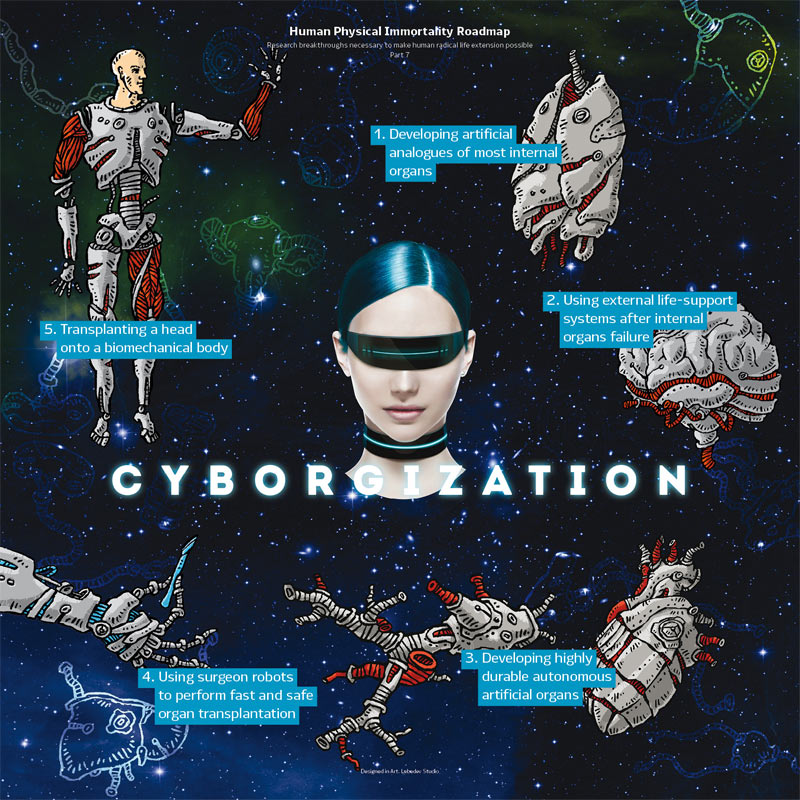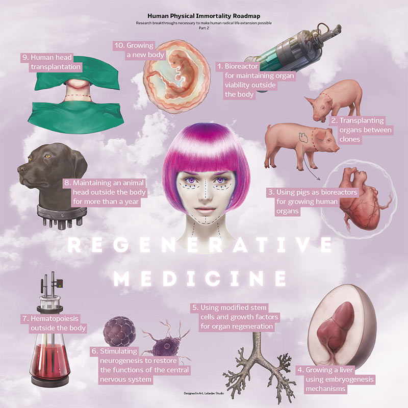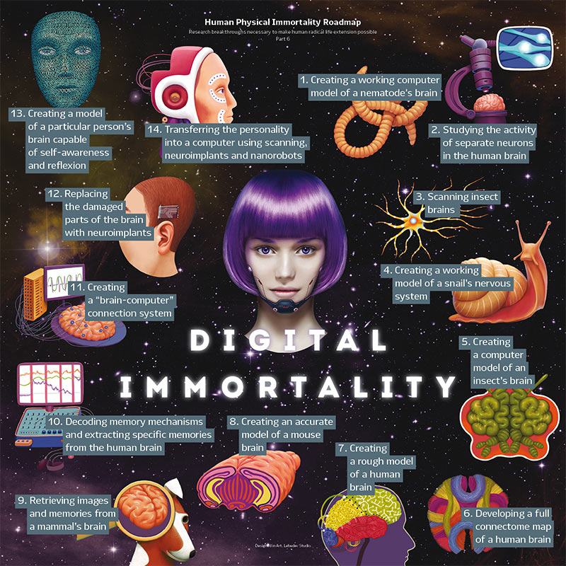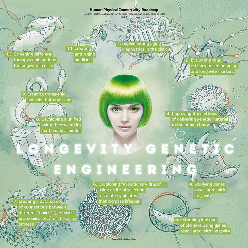 Immortality Roadmap is a project of Science for Life Extension charitable foundation which conducts scientific conferences on social, biologic and technical ways of extending human life. Seven posters representing different ways to achieve immortality were created at the studio.