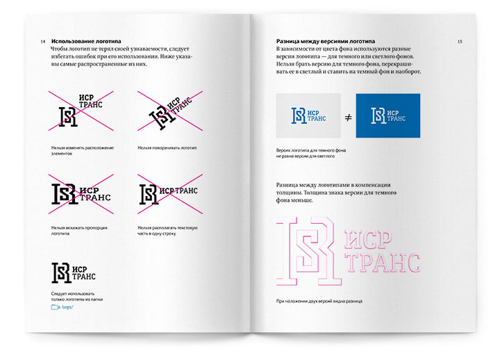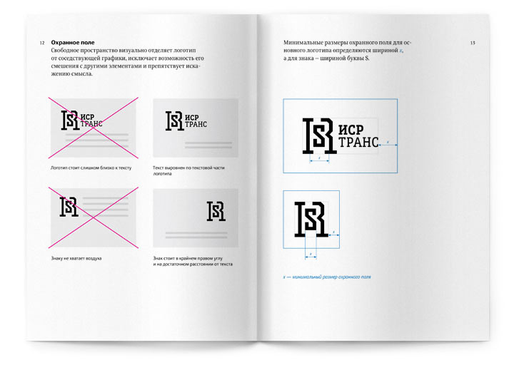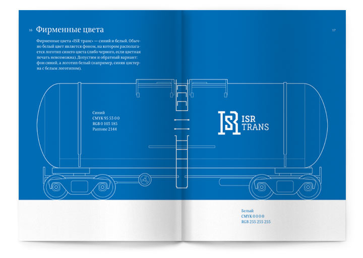 ISR Trans’s signature blue color remained, but became deeper and more saturated. The repeating symbol was used to create a new pattern. Rules for the use of different versions of the logo, the color and the typeface are assembled in a guide.