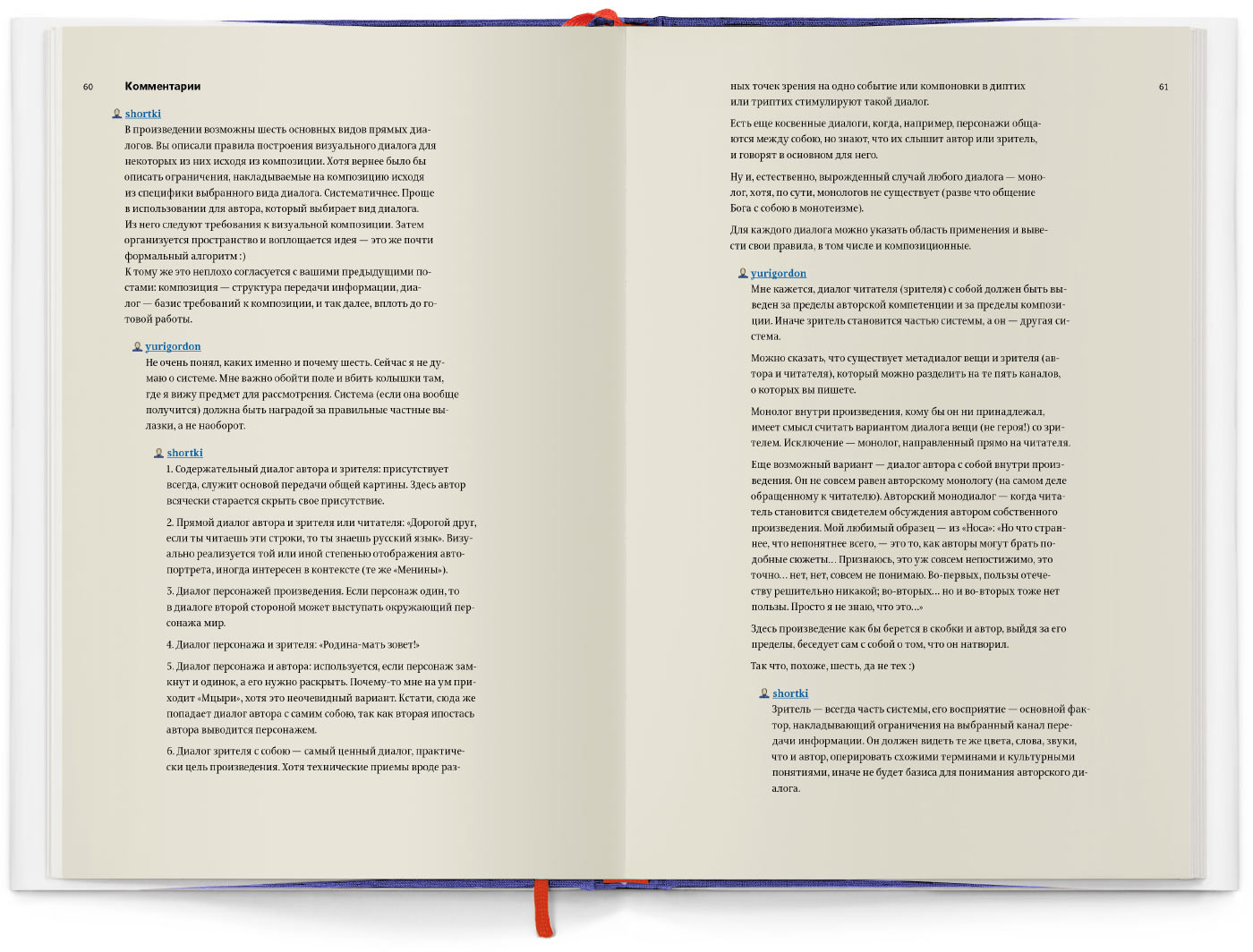 However, the author isn’t writing a textbook, so he isn’t excessively concerned with the precision of his definitions. According to him, he “works with descriptions and metaphors.” His vision captures such objects as the head of Nefertiti, a Velázquez painting, the golden section, text alignment and a shape on a playbill. Using a variety of examples he shows how composition works. The conclusions will inevitably appear subjective, many of them unexpected and controversial. And the author’s views were contested when the book was still in the form of a series of articles in the author’s blog. The most important comments form the first readers of the blog remained in the book.