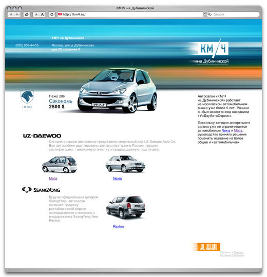 The KM/H car retailer sells Nexia and Matiz cars manufactured by UZ-Daewoo, SsangYong New Rexton offroaders and Peugeot 206.