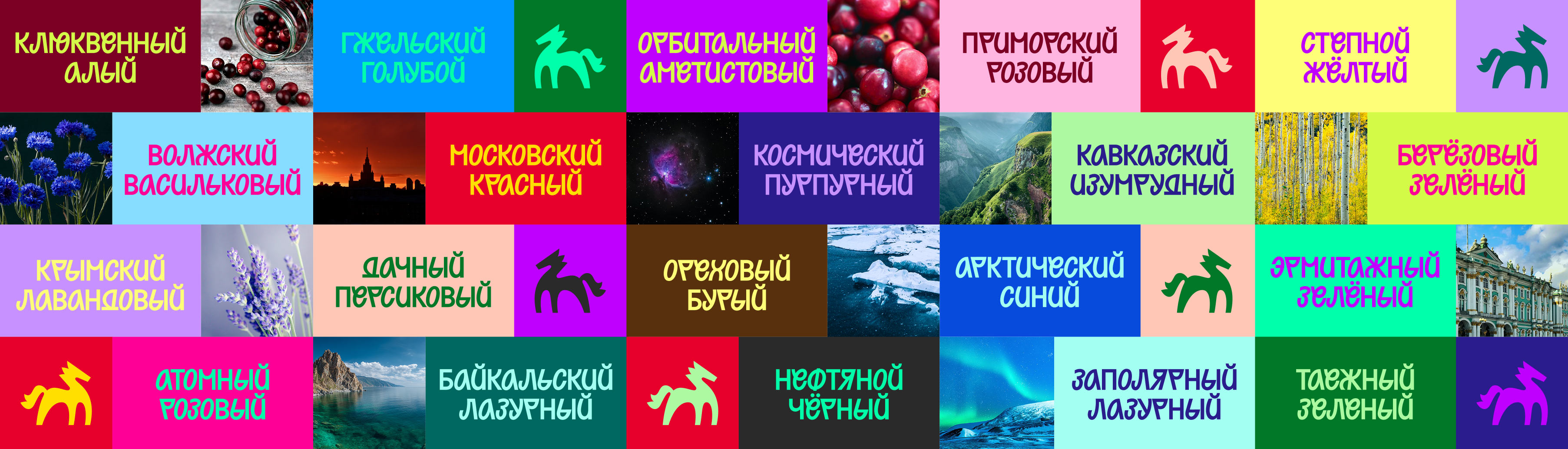 The color palette includes both deep and light colors for various visual experiments. The shades refer to the things Russians are proud of: the largest taiga, the deepest lake and, of course, the most beautiful nature.
