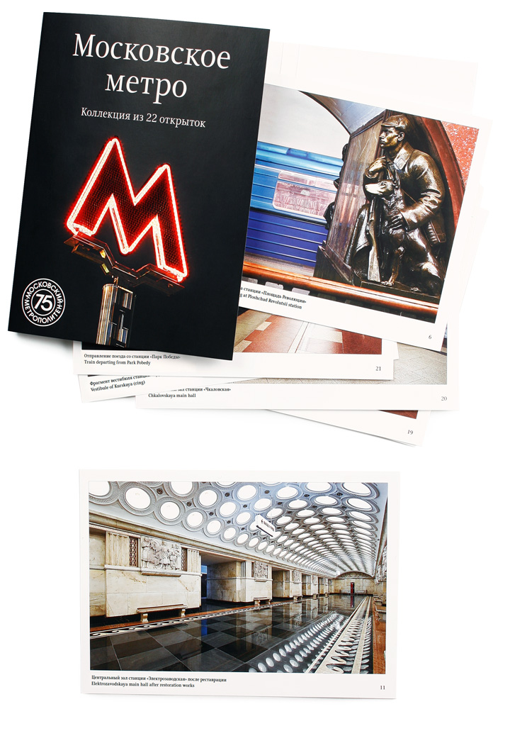 In 2010 the Moscow Metro turns 75. For the occasion we designed a set of 22 postcards. There are photographs of old and new stations, statues at the platforms, the interiors and tunnels. Each postcard has a story of the depicted station on the back.