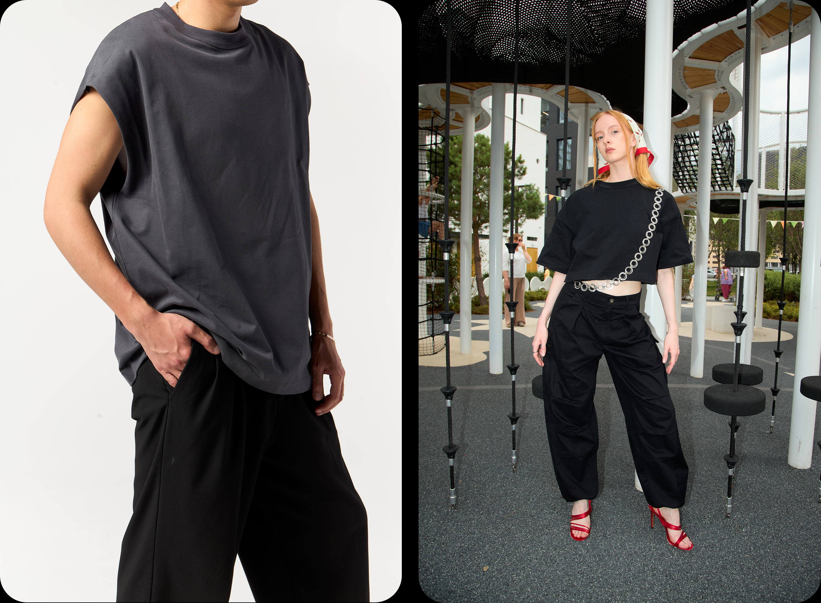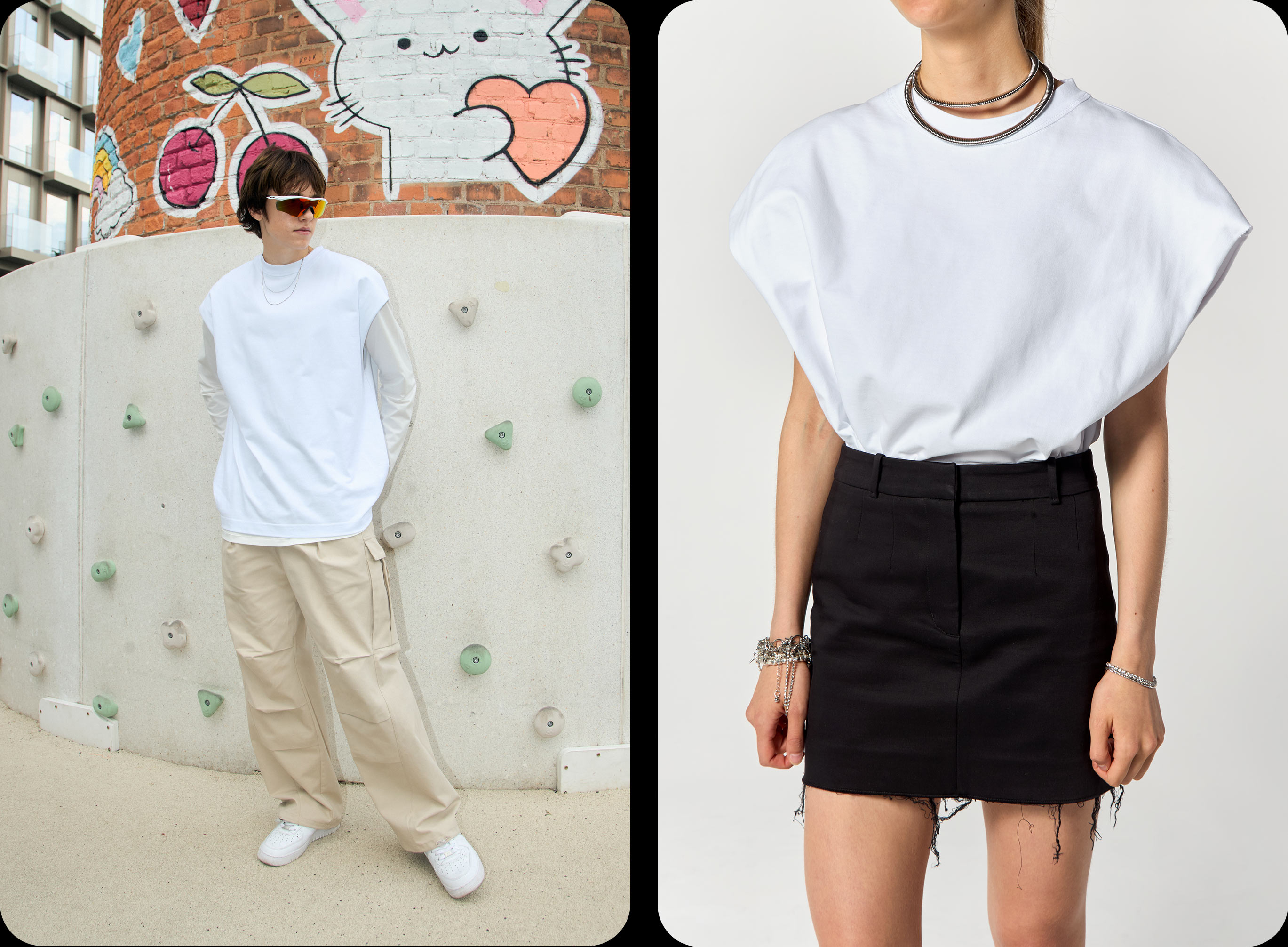Maikus-Oversize (the tank top) and Futbolkus-Krop (the cropped tee) pair equally well with both sporty and classic pieces.