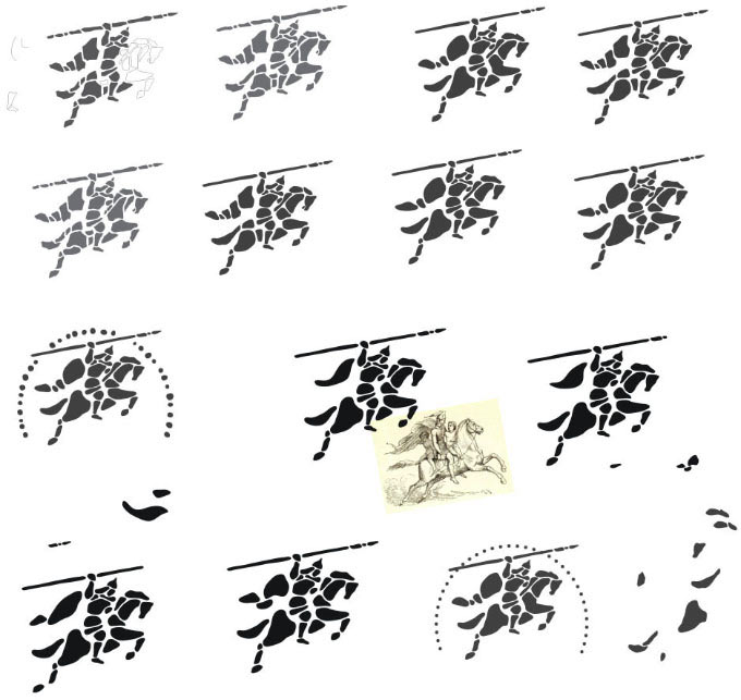 Deciding to go back to the etched shield idea. Stylizing the inscription in stone, so that it brings about a third meaning. The client likes it, but he wants something more classic—a rider with a spear.