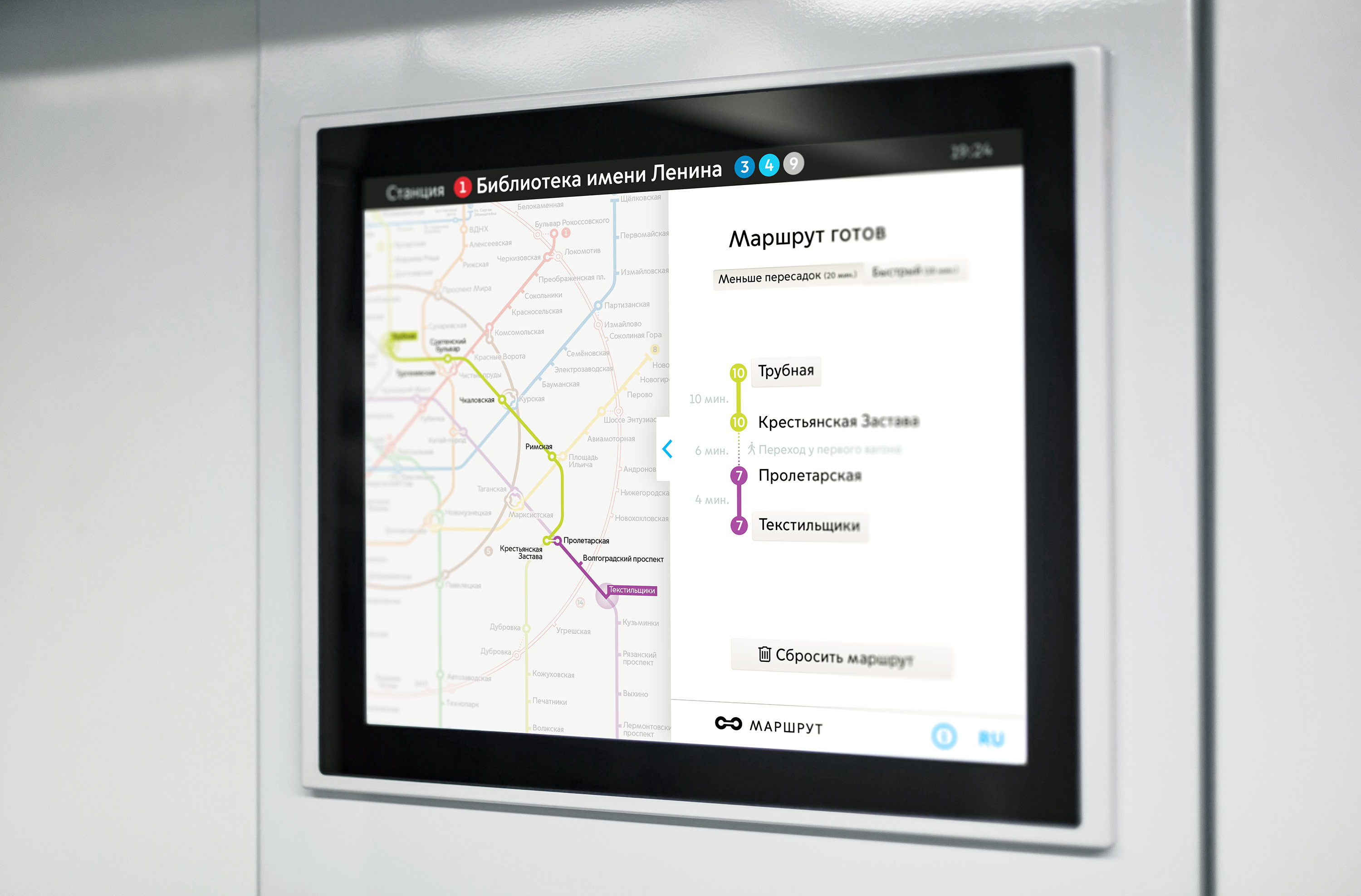 The display located above car doors shows the map of the line and the current position of the train. The name of the current or nearest station is displayed in huge letters helping quickly find it without additional hints. All information is duplicated in English. Pleasant animated transitions between stations take into account the direction of travel.