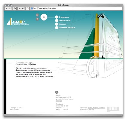 Based on the rating of the National Association of Stock Market Participants, in 2002 Leader ZAO was awarded the Highly Reliable Company status, while in September 2003 the Russian Finance Ministry permitted the company to manage public pension savings. ![]() Color coding was used to design the site sections. At the bottom of every section theres an illustration matching the section theme
