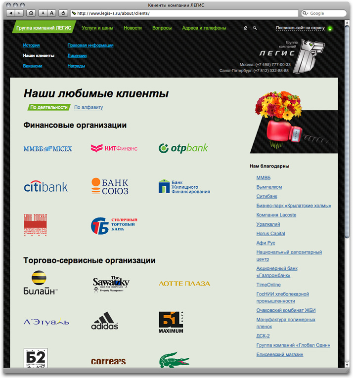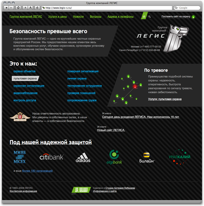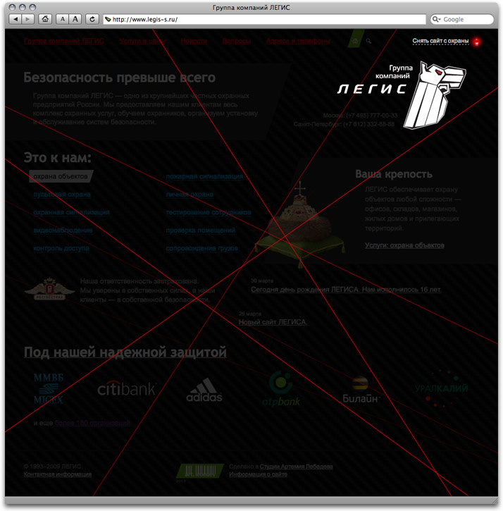 Legis Group offers full range of security services. Having developed their corporate identity, we also designed their website. ![]() Bright images serve to complement overall austere design