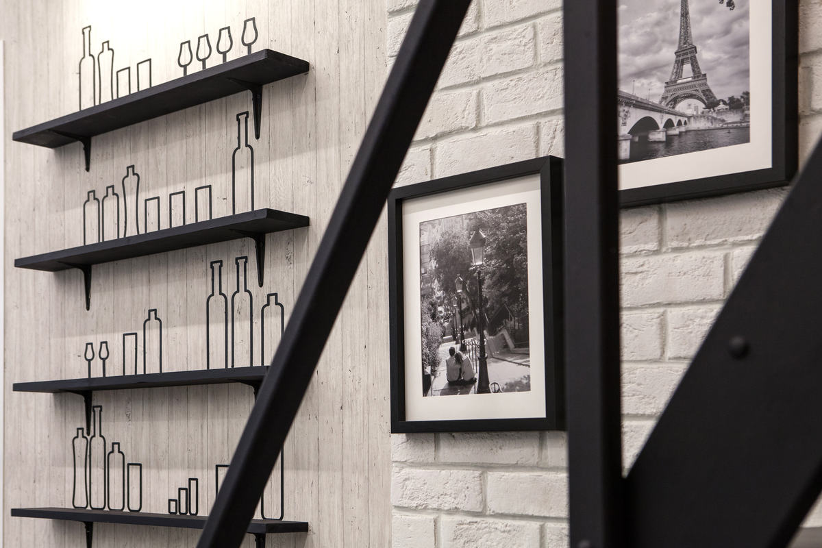 Black wooden shelves are occupied by outline drawings of bottles, glasses and tumblers.