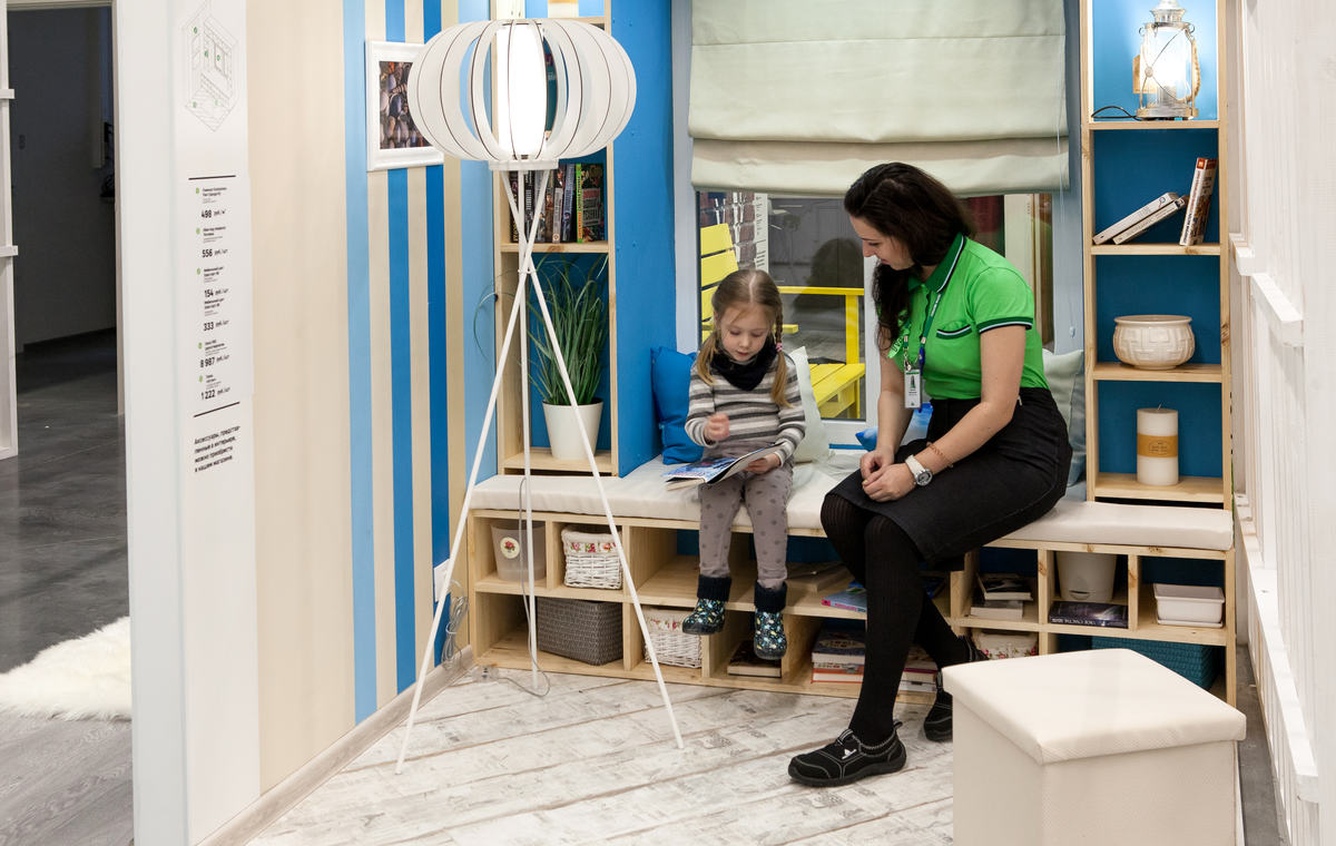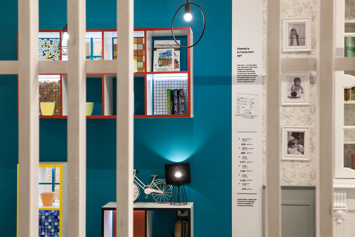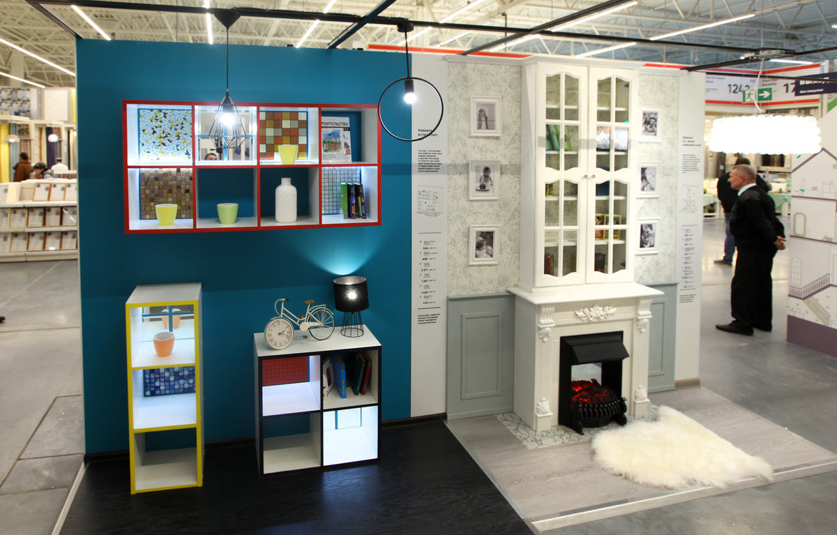 The zone which is seen by all visitors on their way to product shelves contains six mini spaces. Their interiors show how to best use the items sold in the store.