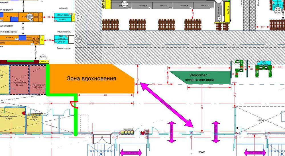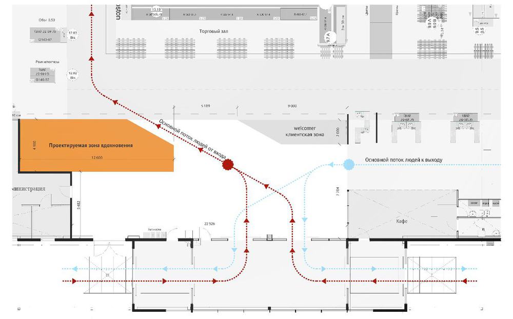 Looking at how visitor flows will be distributed in the store. Realizing that we will need to take into account the location of the main alley. Inside the zone, we will need to build the pathways for people to cover the entire exhibit.