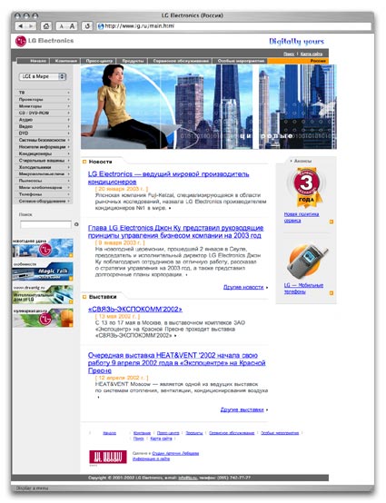 LG Electronics is a large producer of digital TV sets, CD-ROM and DVD-ROM drives, displays, computers, plasma screens, projectors, microwave ovens, vacuum cleaners, air conditioners, washing machines, stoves, audio systems, fridges, mobile devices, etc. ![]() The site features several spectacular flash presentations