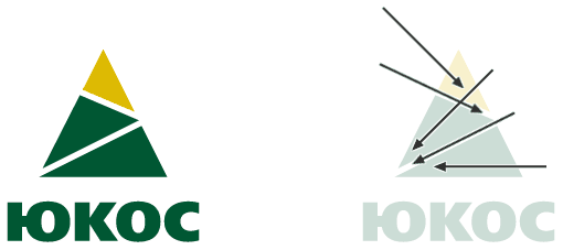 YUKOSs logo is torn apart by two opposite vectors. Even though the white diagonal lines seem to be pointing in the positive direction, their spirit is suppressed by the yellow triangle, which is just about to slide down from the top. The logo was apparently based on the only intrinsically stable polygon, but the very idea is ruined with the sharp angles of all three triangles pointing downwards. It is such a shivery construction that even bold uppercase letters fail to keep it strong. |
