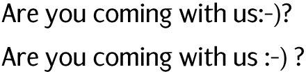 A smiley has to be separated from the word by a space. If a punctuator follows, no space should be put between. As a rule, using an emoticon means no full stop at the end. A smiley may coincide with a closing bracket (given that it is preceded by an opening one :-). |
