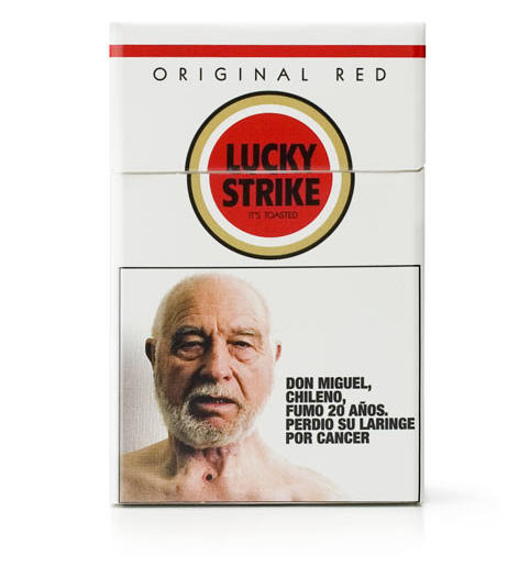 There is a great example of strong confrontation of the kind in Chile. Each and every cigarette pack features an image, half its own size, of Don Miguel, whose 20 years of smoking left him with a hole in his throat. If you look close, you can see it there. |