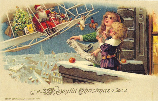 Ded Moroz always walks or rides on snow-covered ground with his route starting somewhere in the woods. Santa always flies high in the sky. |