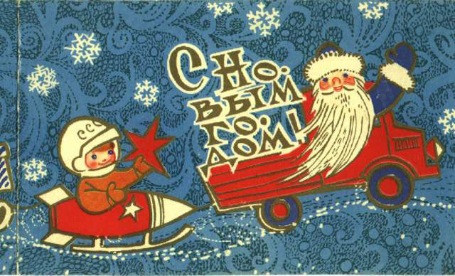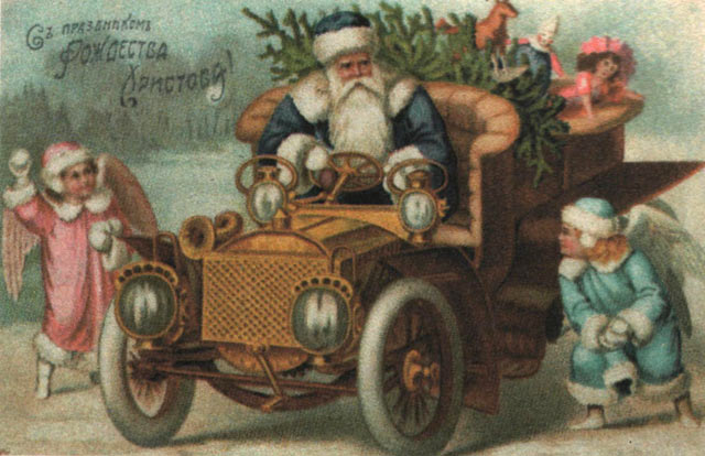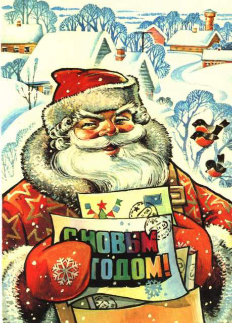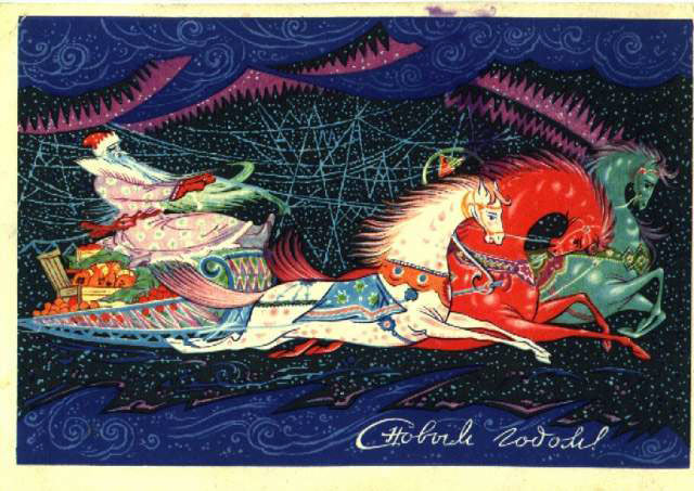 Ded Moroz rides his sleigh pulled by three horses as opposed to nine reindeer. Sometimes Ded Moroz can drive a truck. |
