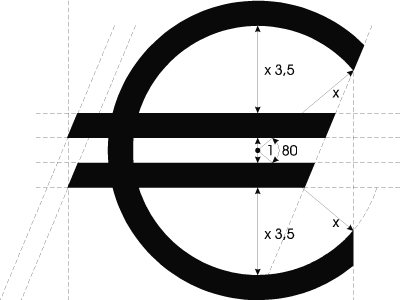 Its worth noting that the parallel bars are skew at the ends. Outside the C symbol the two bars are positioned one above the other. Inside the symbol the lower bar is shifted to the left for a distance computed by prolonging the directrix downwards at the angle of skew of the upper bar. Official euro sign in different formats |