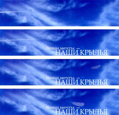 In early 2001 Ural Airlines launched a flash clip at its website, which I thought was well worth saving. In the clip an Il-86 jet is swooshing away through cirrus clouds. Several seconds afterwards the slogan Your dreams are our wings emerges. Another couple of seconds elapse before a small feather comes hovering onto the slogan from the point in the sky where the plane has disappeared. |