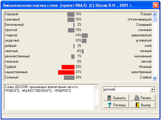 There is a computer psycholinguistic system called VAAL. Its used by professionals to analyze texts in the Russian language. You can download your entire database of newspapers of the past year into the program and see how peoples attitude to your mayonnaise has been fluctuating, and whether its high time to add some meat to the sausages youre making. A serious tool for no-nonsense analysts, politicians and economists. |
