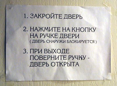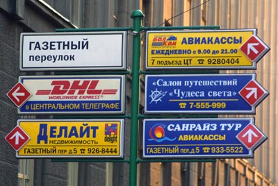 At the next photo the results of the fourth stage of a design orders lifecycle are laid bare. This is a cluster of street signs in Moscow which are supposed to give a clue and help you keep your bearings. Designers failed to accomplish the navigation task (try to figure out how you can get to the air ticket vendor, for example,the top yellow sign on the right hand side). |