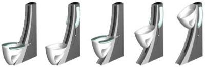 At the fourth stage, as far as a toilet seat is concerned, a design solution would be a toilet bowl model in which the space between the tank and the seat is broad enough to allow the user to lift both the lid and the seat and leave them standing by themselves. But some may go farther, as did the designers of the British firm Twyford. They devised a super-john able to determine the users sex by his/her voice and accordingly convert itself into a urinal, if need be. This makes it comfortable for all (I guess): |
