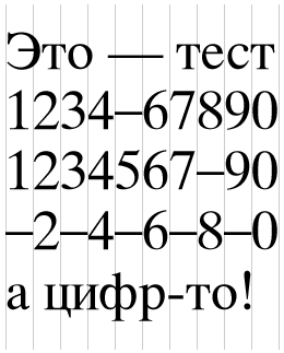 Иллюстрация показывает разницу между тире, минусом и дефисом. Обратите внимание: знак минуса занимает по ширине столько же места, сколько и любая цифра: |