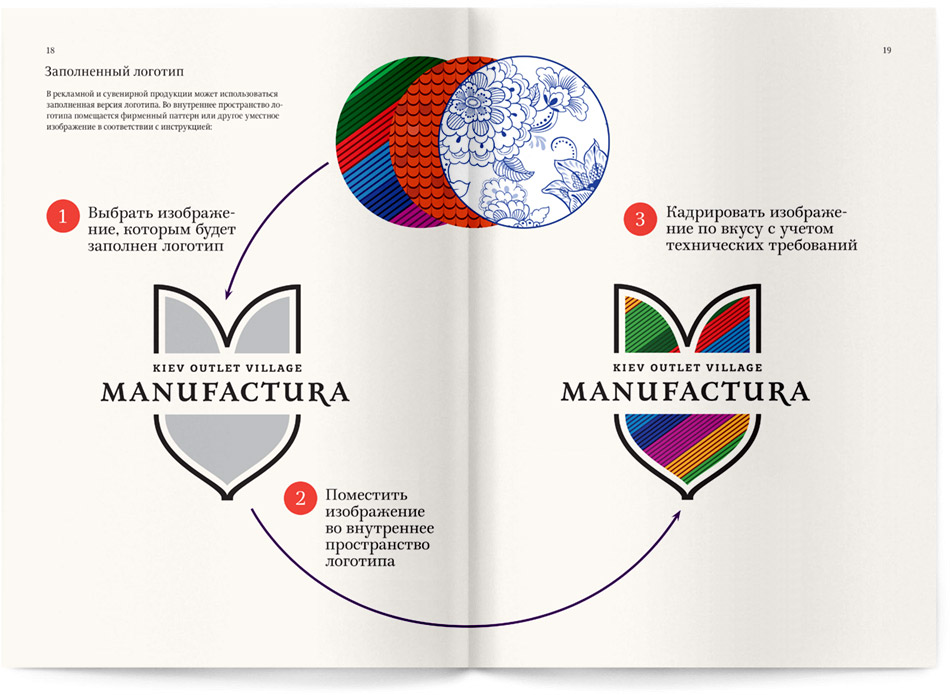 The Dutch theme is supported by corporate patterns which are used in the logo design or on their own. Two styles of the studio’s Mirta typeface are used as the corporate typeface of Manufactura. Rules for the use of the logo, the pattern and the face, as well as recommendations on creating advertising materials, signs and navigation boards are given in the brand book.