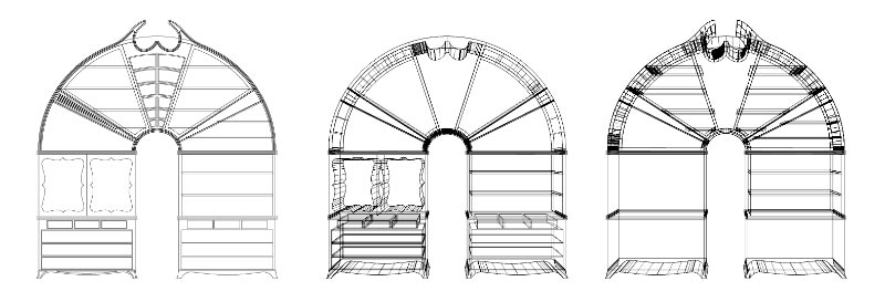 Second try, different approach. Furniture sketch on thick gold paper. Rejected by the client.