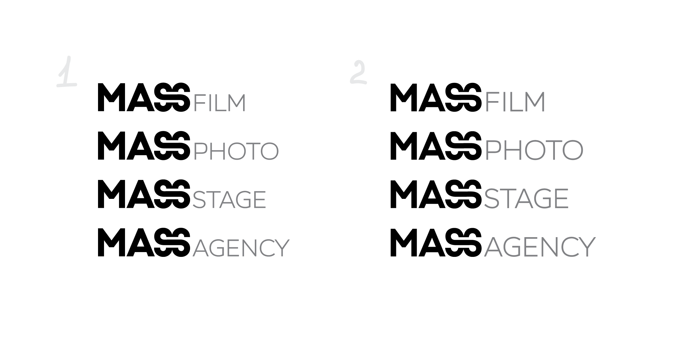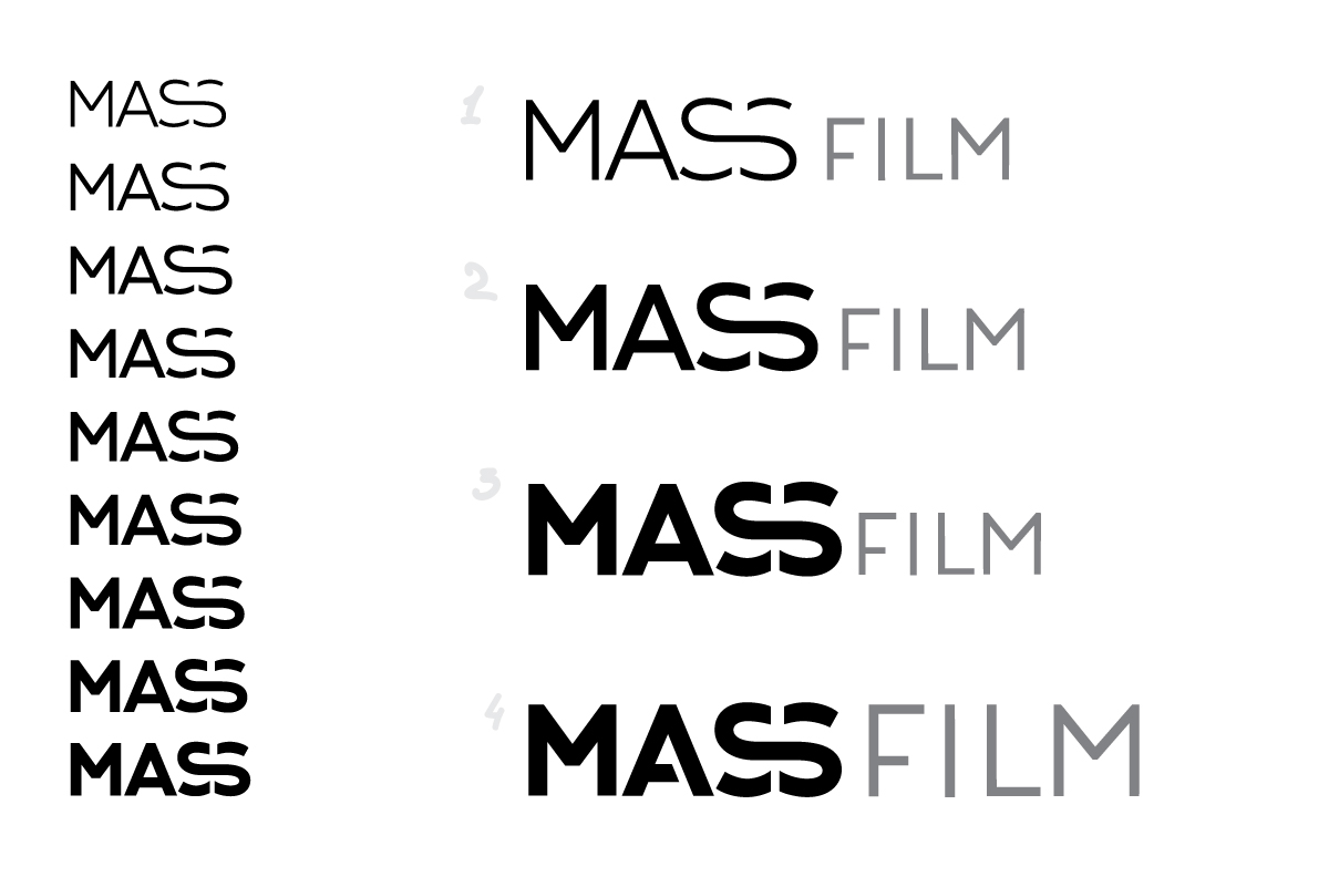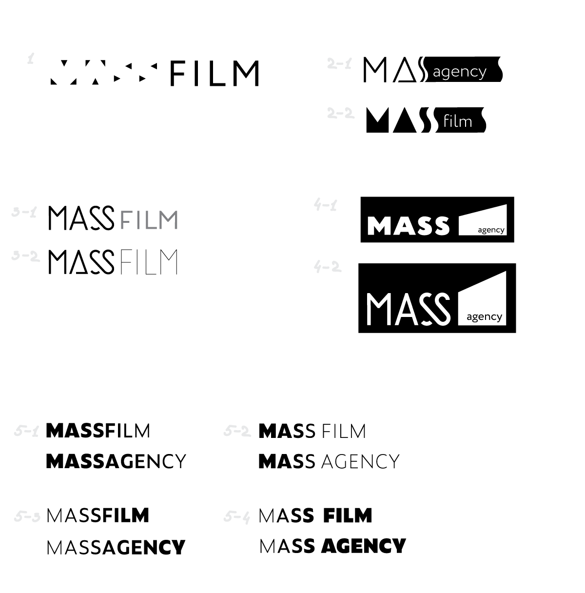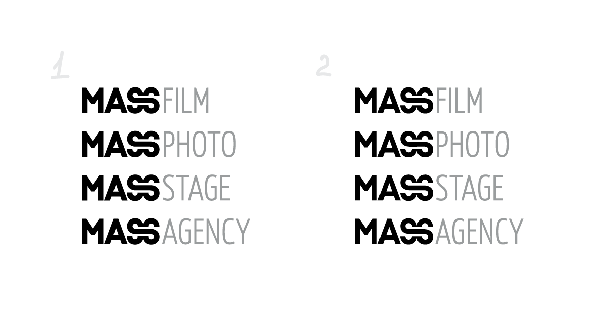 We deal with communications and production but our main specialization is time-sensitive content. We are providing event coverage, preparing reports and content for social networks during an event at a quality level. Right now we are expanding our service range to include immediate photo and stage support and creating a unified service offering. This will be called Mass Agency and will have three branches: Film, Photo, Stage. So the only thing we would ask you to keep in mind is that we need a single pattern and a modular logo so we can interchange the words Agency, Film, Photo, Stage while keeping the Mass base.
