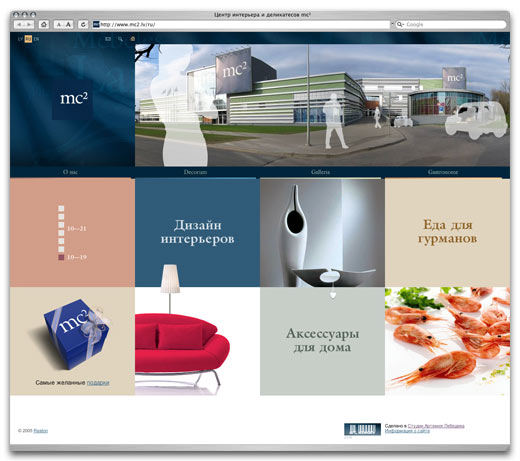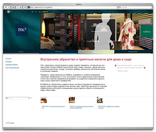The mc² retail center is based in Riga. Its three large hallsDecorum (interior design), Galleria (home accessories) and Gastronome (gourmet food)have a total area of 13,000 square meters. ![]() Main page