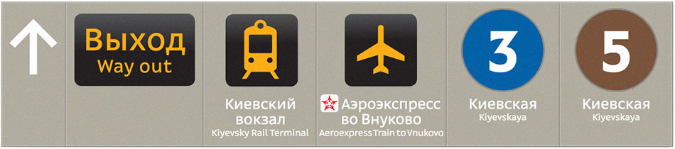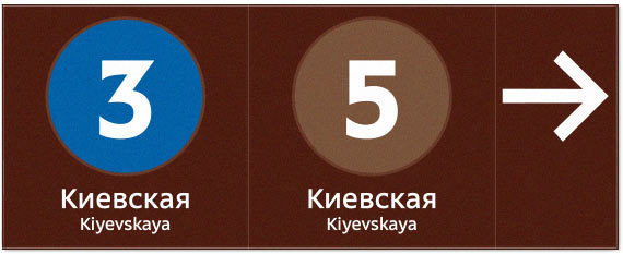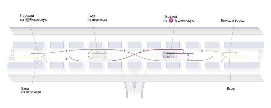 Traditionally, vestibules in Moscow Metro are named after one of the stations of the transfer hub, even when the vestibule provides access to several Metro lines. For example, the shared entrance to Tverskaya and Pushkinskaya station is named Pushkinskaya Station, while the entrance to Pushkinskaya and Chekhovskaya stations is simply Chekhovskaya Station. Floor navigation signs have names of all stations in a transfer hub, since it is always easier to make a transfer through a neighboring station than to go out on the street and look for a different entrance.