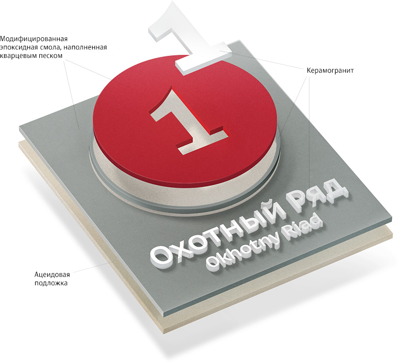 The navigation elements are created using strong and durable materials: the base is asbestos arcing-resistant board; the upper part is made of modified epoxy filled with quartz sand; the letters, digits and arrows are made of ceramic granite. Elements are colored in the mass which allows them to maintain color longer despite demanding conditions.