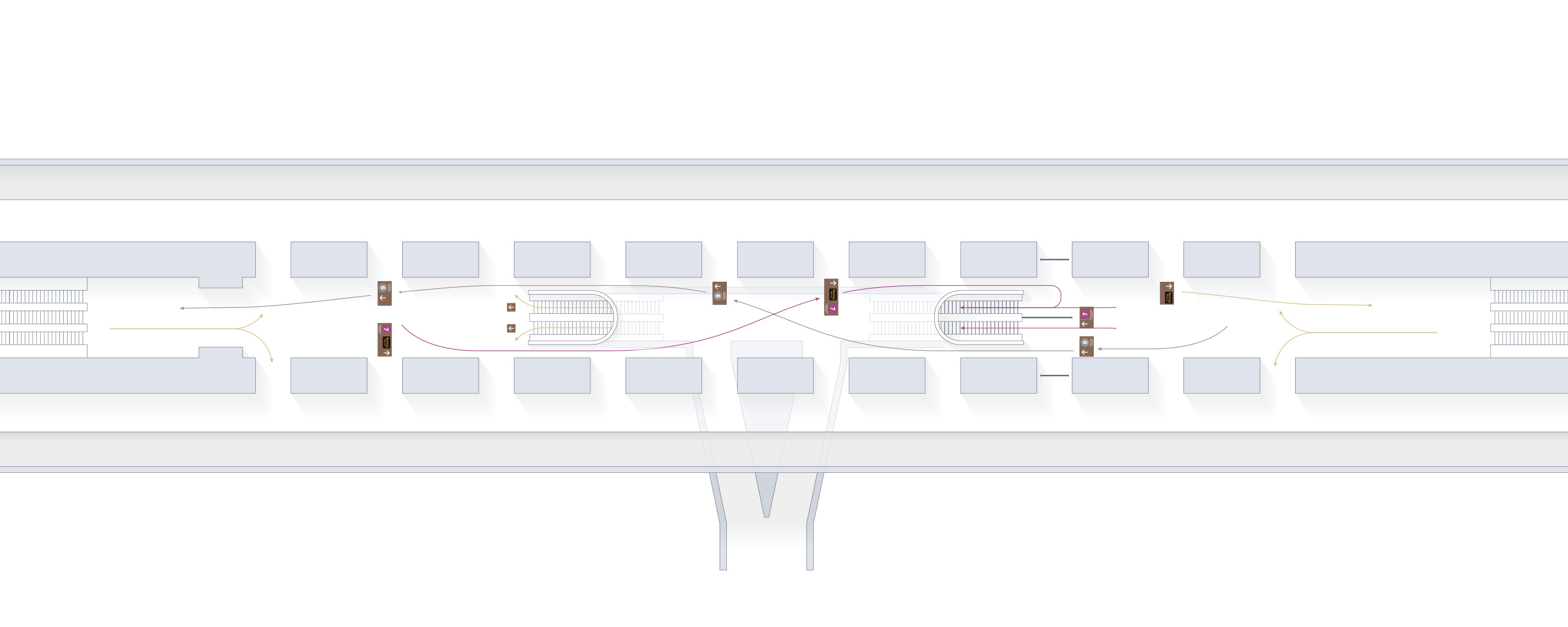 The signs show only the directions that are immediately helpful to the passengers, helping to remove distracting information and increase legibility. Signs showing the way to neighboring stations display no arrows to reduce clutter. Direction arrows appear only in situations where it is important to direct people to prevent them from walking against the oncoming passenger flow.