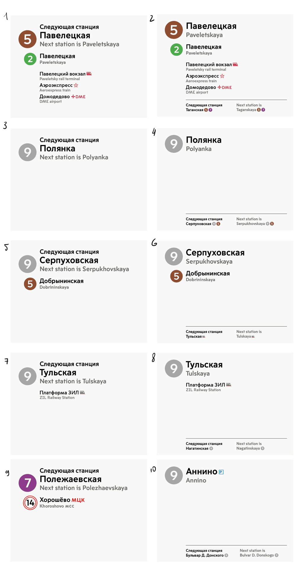 Deciding whether to make the maps black or white. We already know that black maps look good. But they do not fit well into the existing system: they would be the only ones to use black background. Which is why we need to test white maps as well. Comparing black and white maps in a train car. The white ones look good, we will be using them. Starting to typeset the rest of the maps. Simultaneously updating the typeface, icons, transfers, etc. Overall there will be two types of maps: for strips of 30 LEDs with an information screen and for strips of 32 LEDs with no screen. Deciding to typeset a map for each of these cases and then generate the rest of the maps based on that example. Preparing maps for the third and the seventh lines.