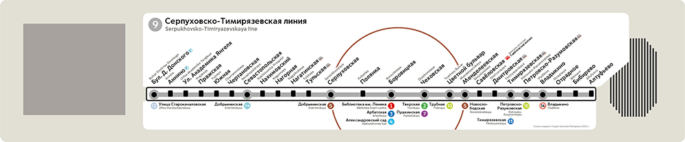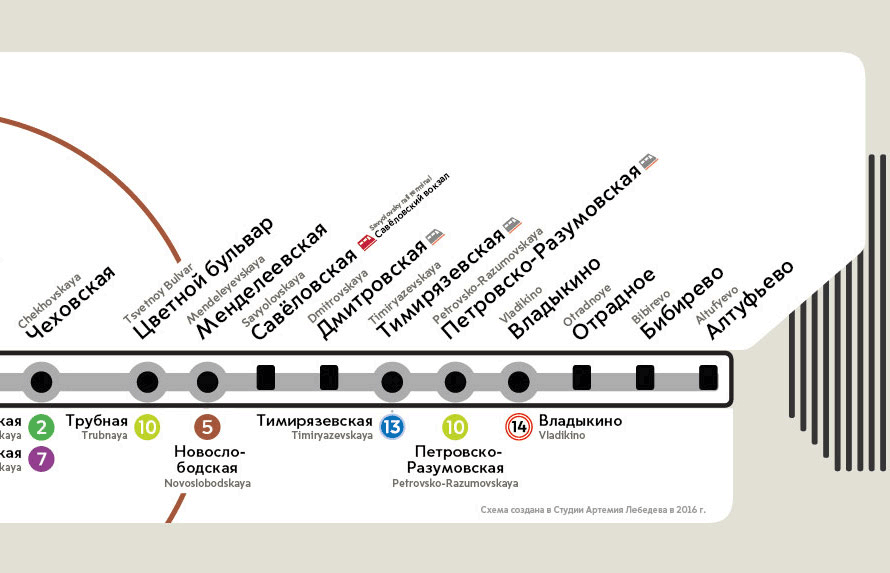 The art director says that the area near Novoslobodskaya, Timiryazevskaya and Petrovsko-Razumovskaya doesn’t look good and suggests to label a couple of transfers inside the circle and center-align their names. Also we need to decrease the typeface size for station names, right now they all look lumped together.