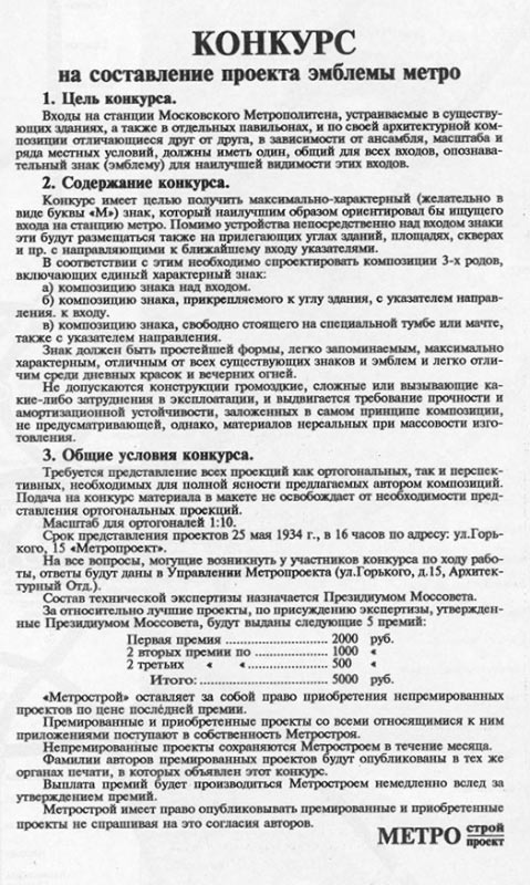 Artemy Lebedev became interested in this post and sent me a cut-out from a 1934 newspaper which mentioned an open contest for a Metro logo: http://tema.livejournal.com/1383454.html.
