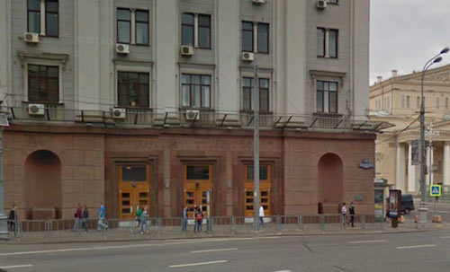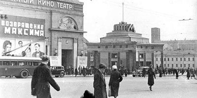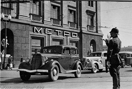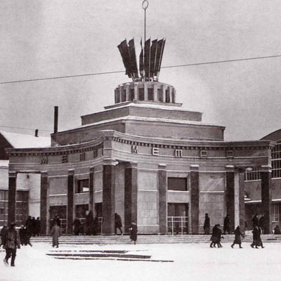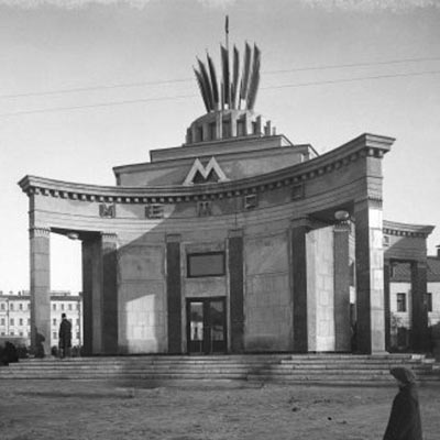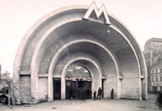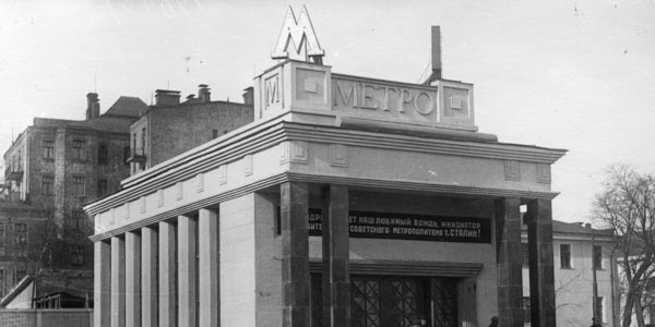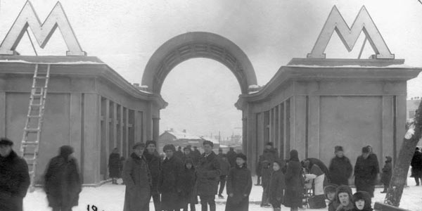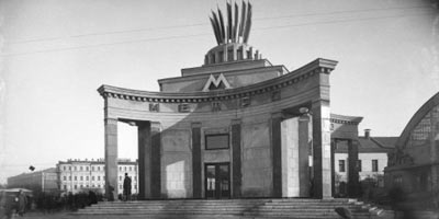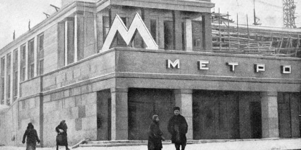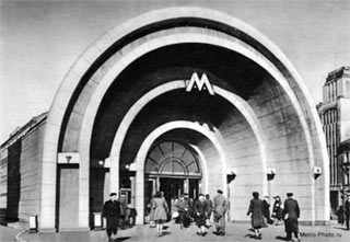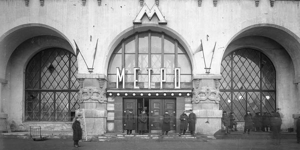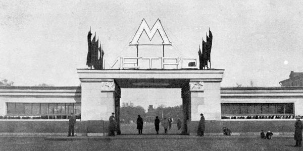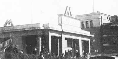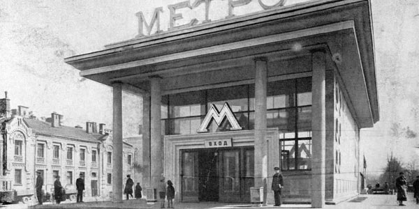 Entrance to Arbatskaya station, circa 1938. A number of letters around the entrance was replaced by one letter on top overlooking Arbatskaya ploshchad |